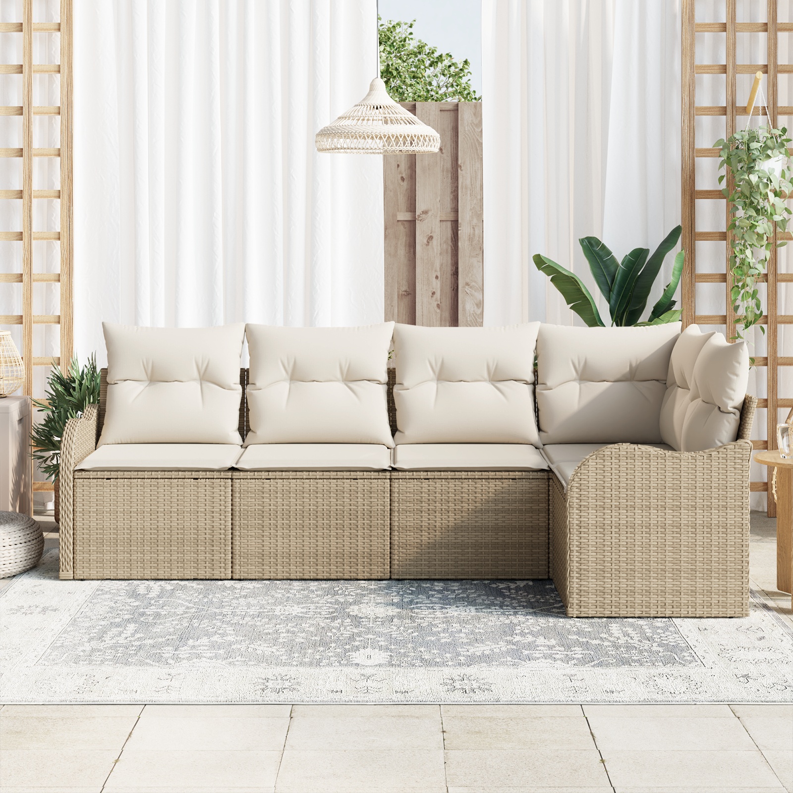 • Caracteristici / Funcție / Design: Cu designul lui modular, setul de canapea se poate adapta rapid pentru a se potrivi oricărui spațiu exterior. Picioarele reglabile te ajută să obții o așezare stabilă pe orice tip de suprafață. Designul țesut manual îi dă un aspect stylish, dar păstrează și funcționalitatea.