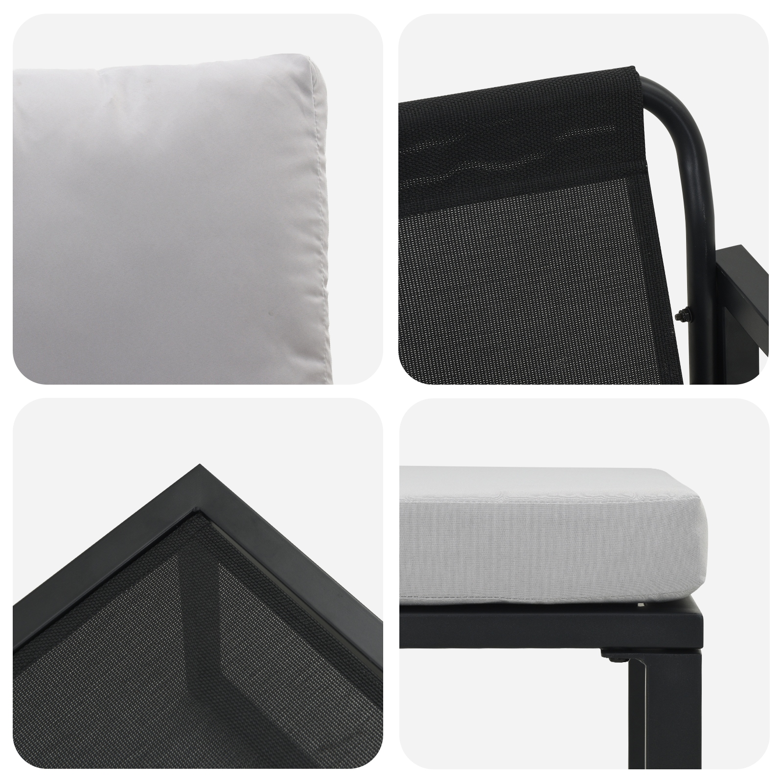 - Materiale: Mobilierul ăsta are un cadru din oțel solid, vopsit electrostatic ca să reziste mai bine. Face față la toate condițiile de vreme și rămâne elegant ani buni, plus că e rezistent la UV, deci nu se decolorează la soare puternic.