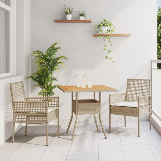 Setul ăsta de masă și scaune pentru dining afară îmbină stilul modern cu utilitatea practică, perfect pentru mese confortabile pe balcon sau patio. Cu un cadru bej chic și o suprafață din lemn de acacia, creează o atmosferă caldă și primitoare pentru a lua masa și a te relaxa.
