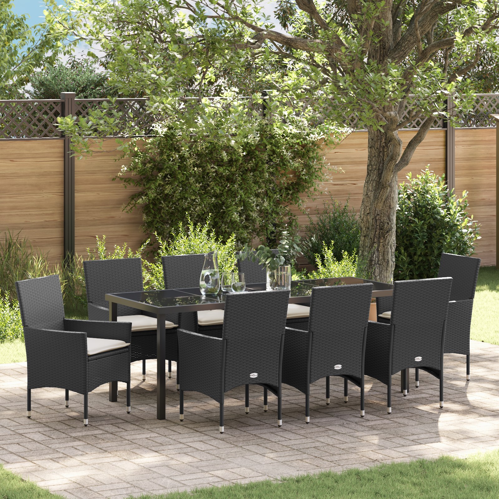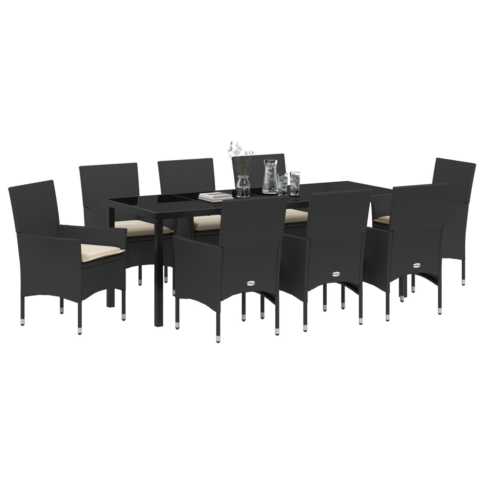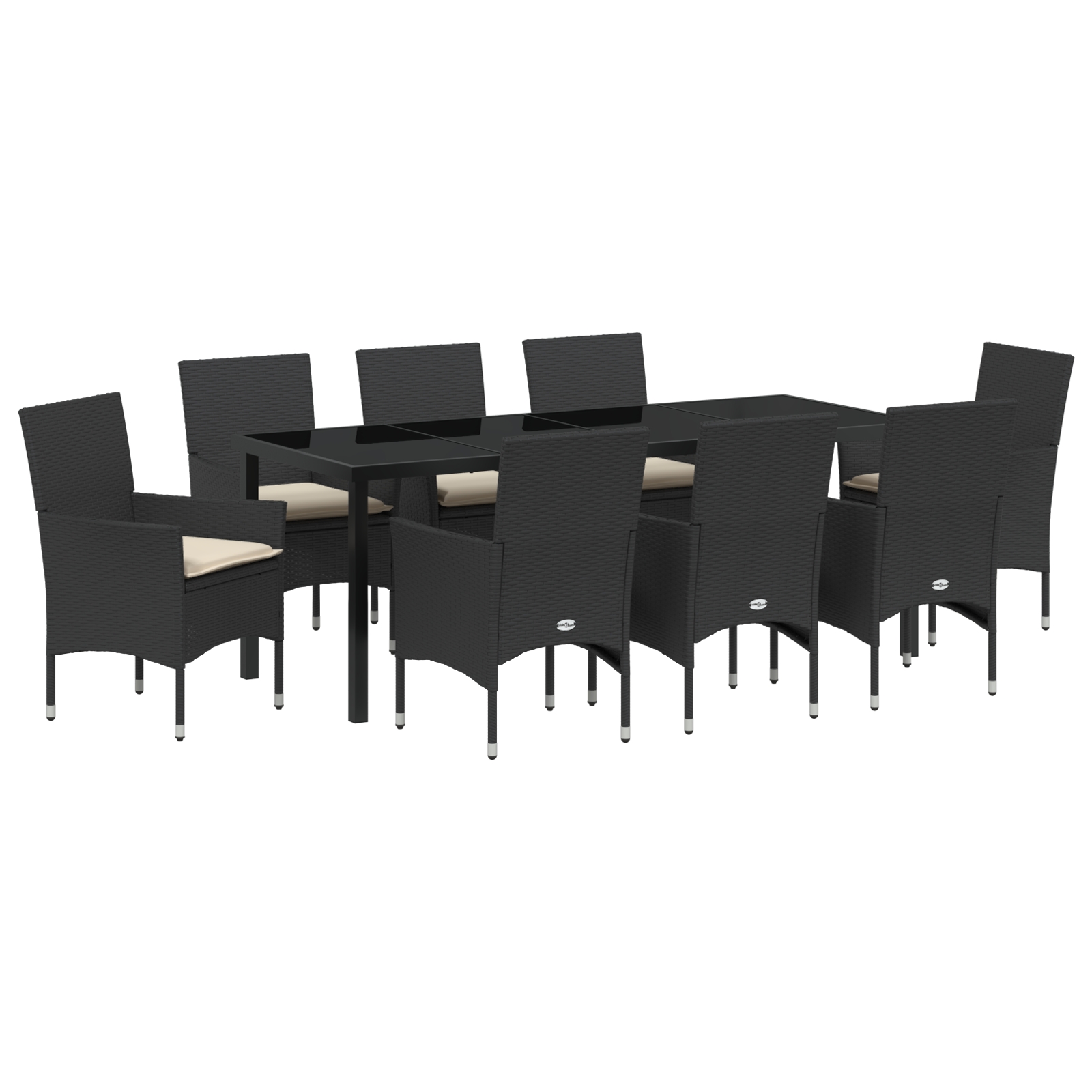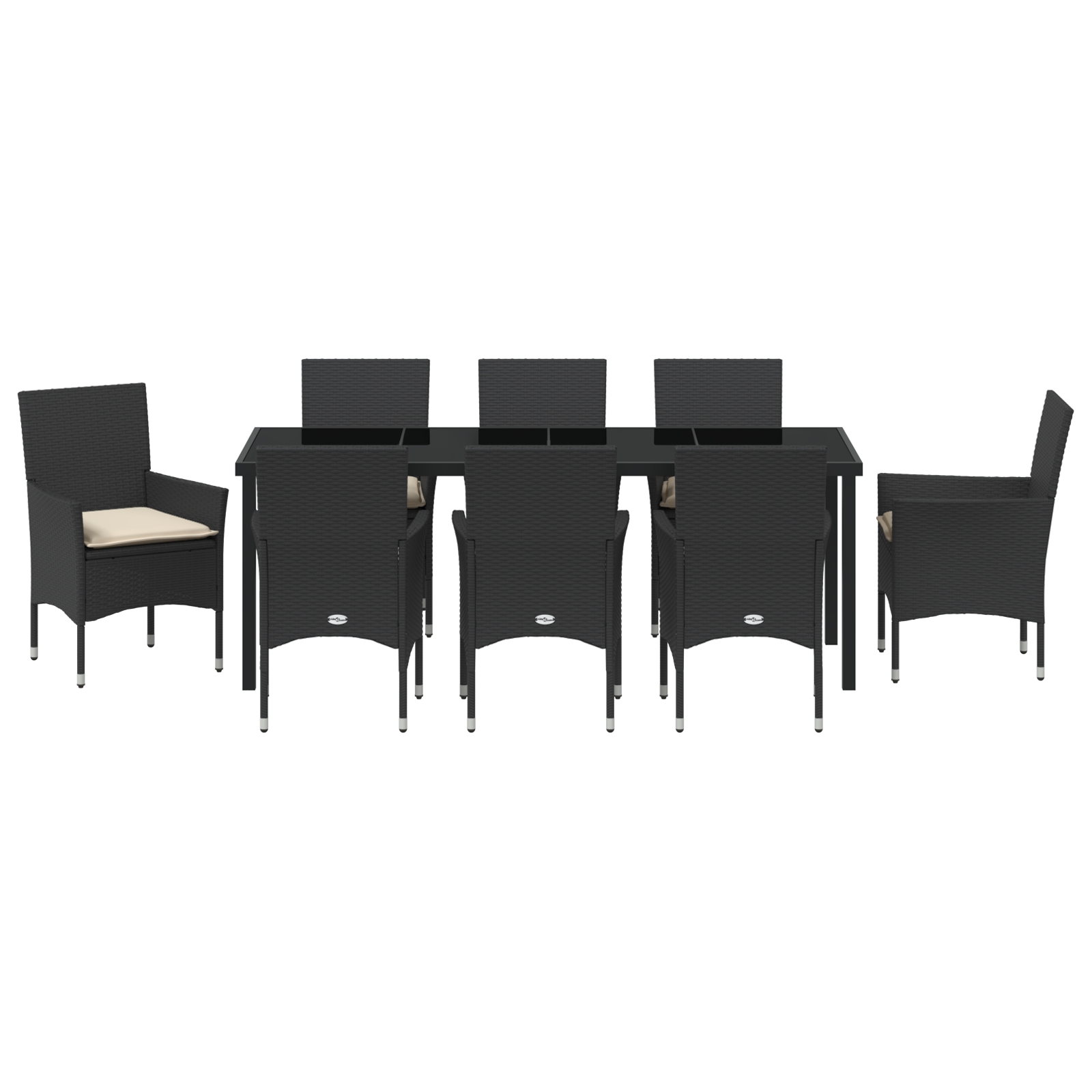 Set de Dining cu 9 Piese cu Perne Ratan Poliratan Negru, Masă de Grădină Neagră 200x80x73 cm Sticlă Securizată