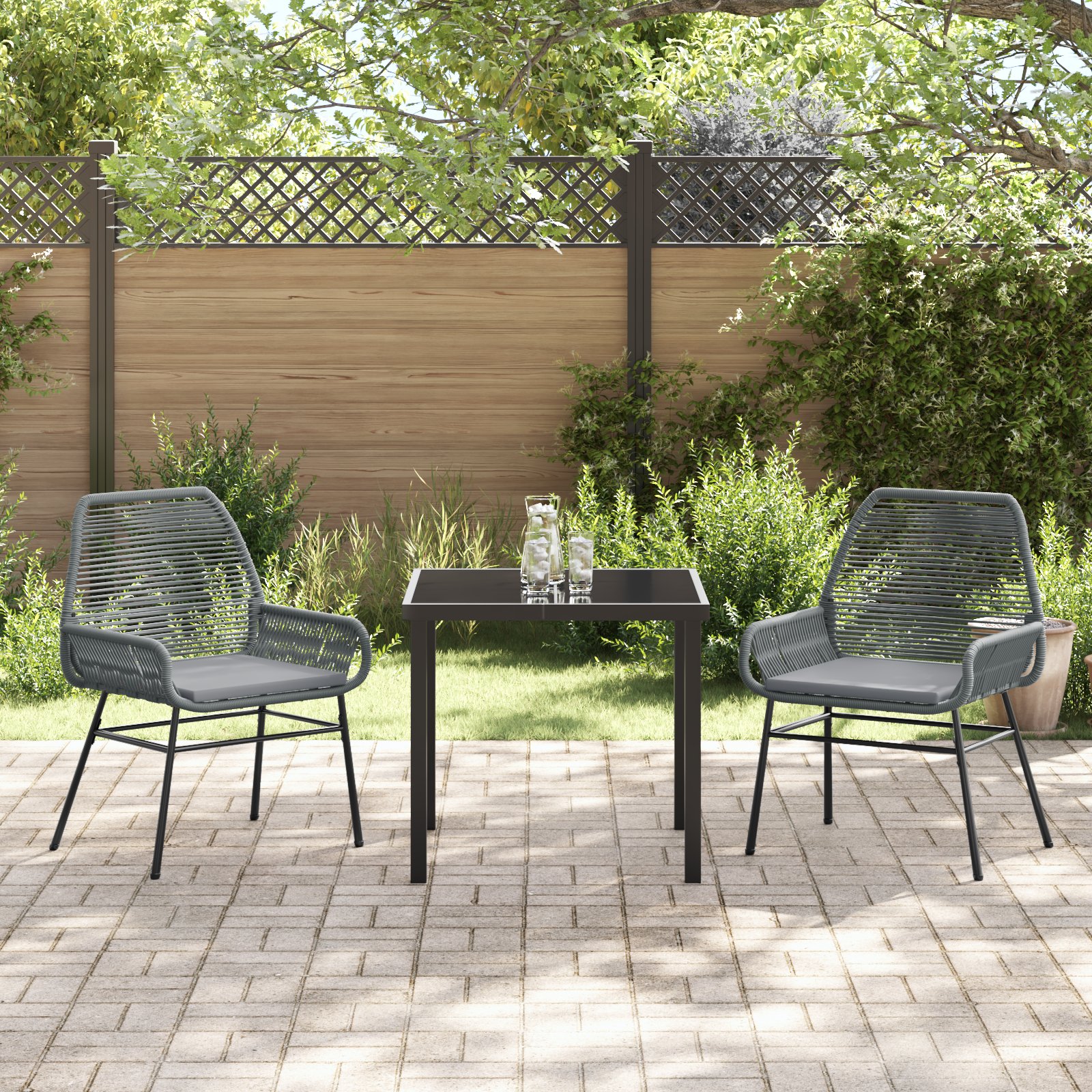 - Componente complete: Fiecare scaun are cotieră și spătar din poliratan confortabil pentru un plus de stil și confort. Blatul de sticlă e perfect pentru mesă și e ușor de curățat după utilizare. Această combinație de materiale îți oferă un set elegant, care funcționează bine pentru orice ocazie, îmbunătățindu-ți experiența în aer liber.