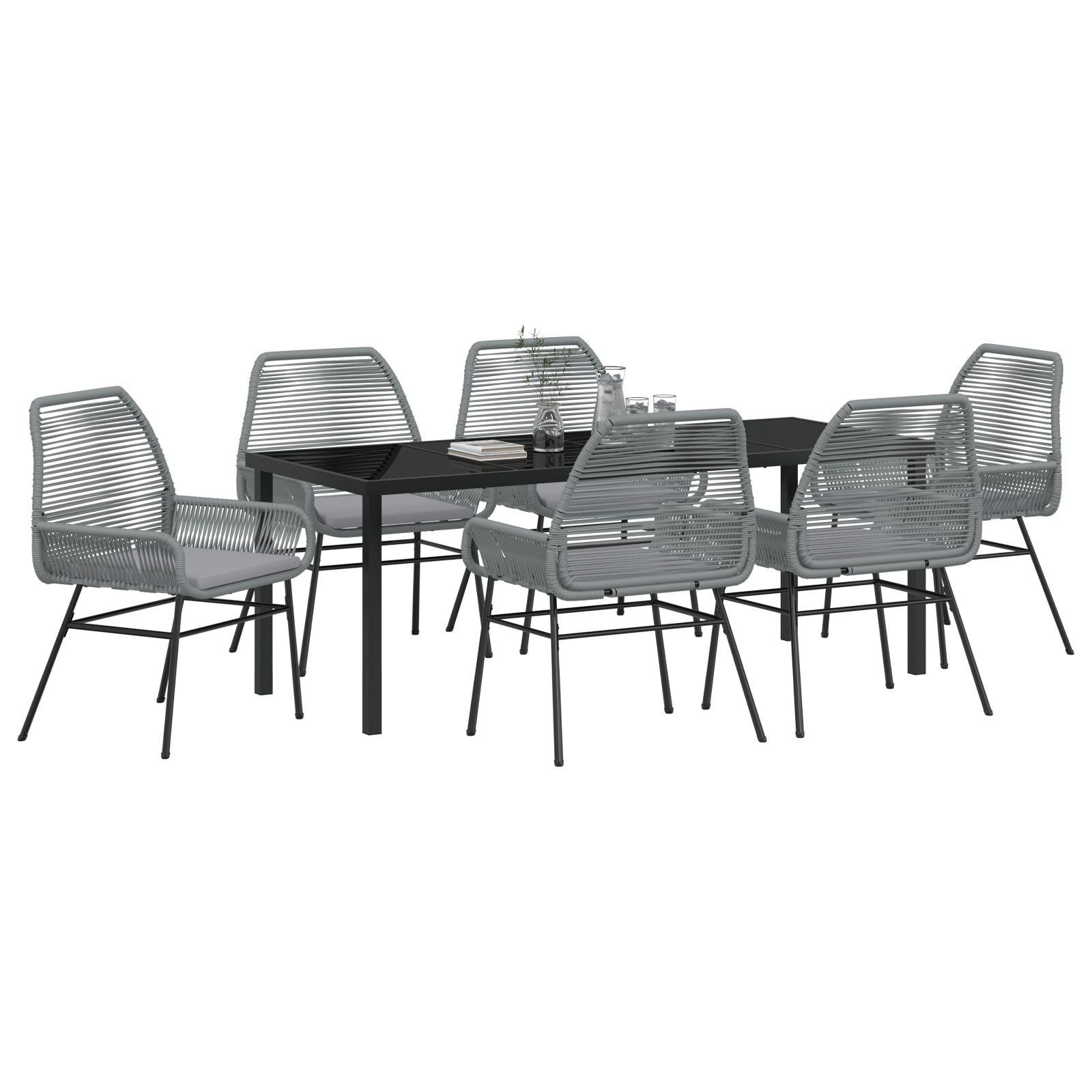 - Experimentează confortul total: Fiecare scaun are perne groase de gri închis, cu material rezistent la intemperii, oferindu-ți o experiență de ședere plăcută fie că mănânci sau te relaxezi.