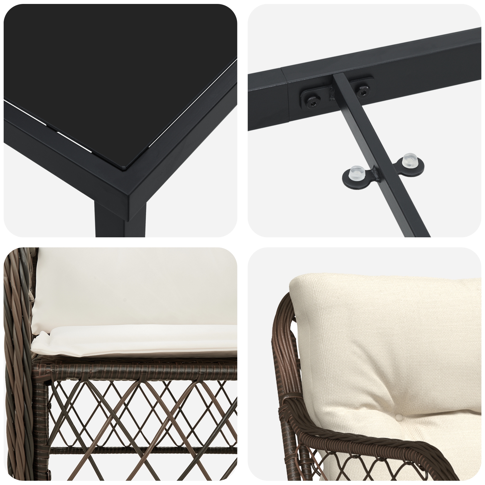 - Elemente de Design Funcționale Are o masă din sticlă securizată, combinând stilul cu practicitatea. Suprafața clară rămâne constantă, oferind un loc stabil pentru mâncare și băuturi. Și e rezistent la intemperii, adăugând la durabilitatea sa.