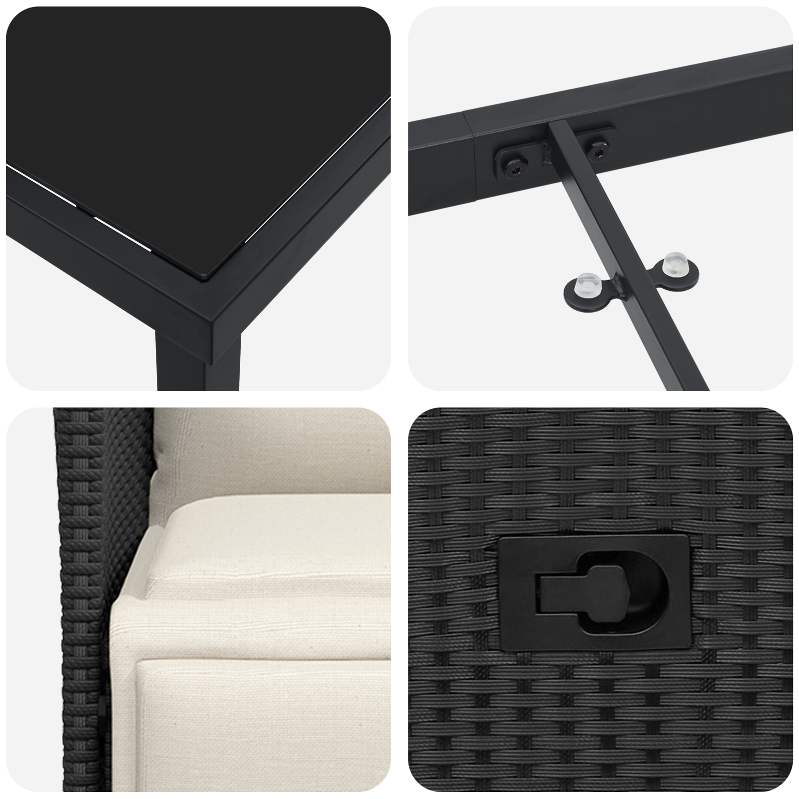 - Textură Poliratan: Fabricat din poliratan de calitate, setul ăsta are o finisare faină care e stylish și rezistentă la razele UV și apă. Materialul robust înseamnă că va rezista și va arăta bine indiferent de vreme.