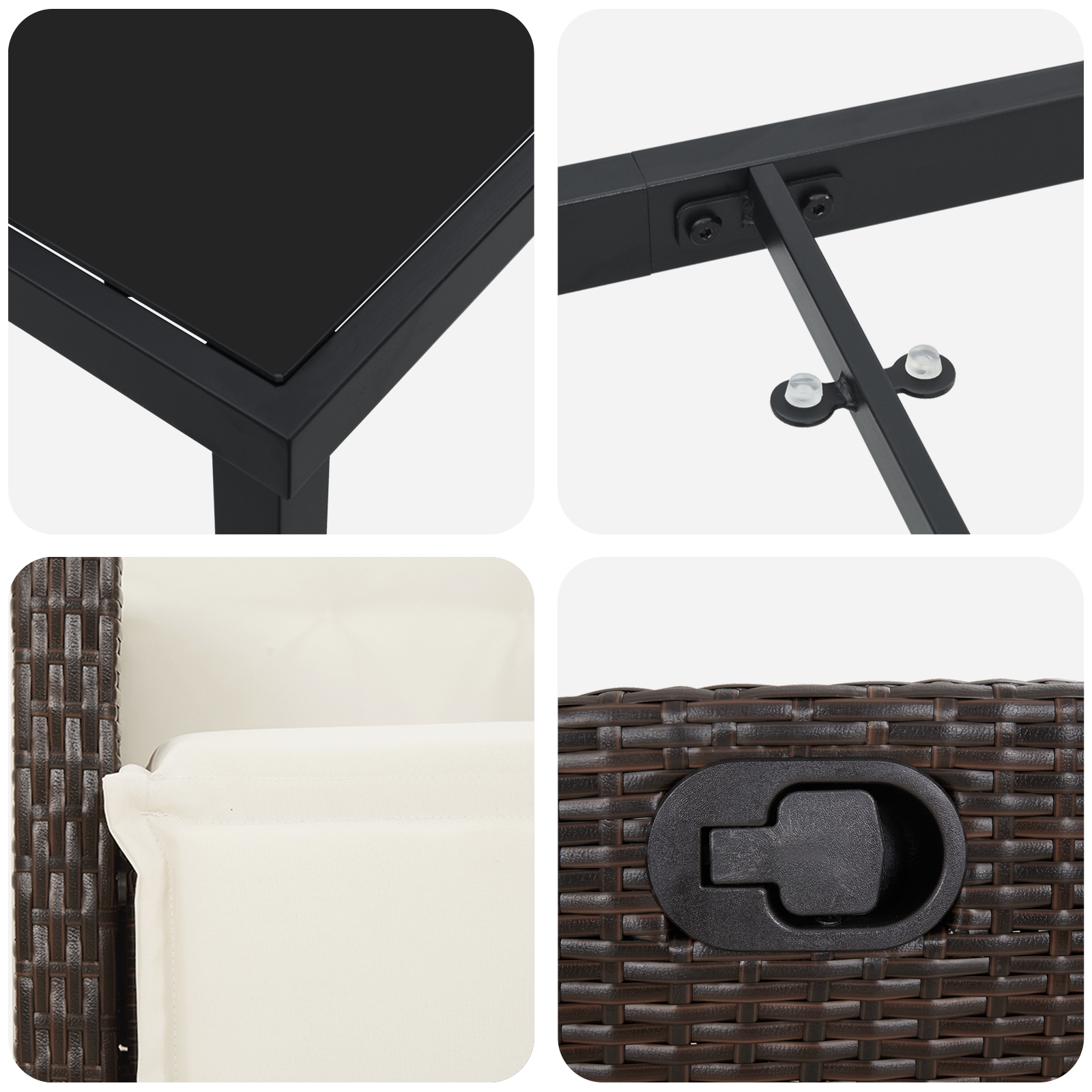 • Materiale durabile: Setul ăsta e făcut dintr-un mix grozav de poliratan și oțel. E rezistent la vreme și construit să dureze, ideal pentru utilizare în aer liber. Textura poliratanului arată bine cu cadrul robust din oțel, așa că se menține stabil și elegant pentru distracția de zi cu zi.