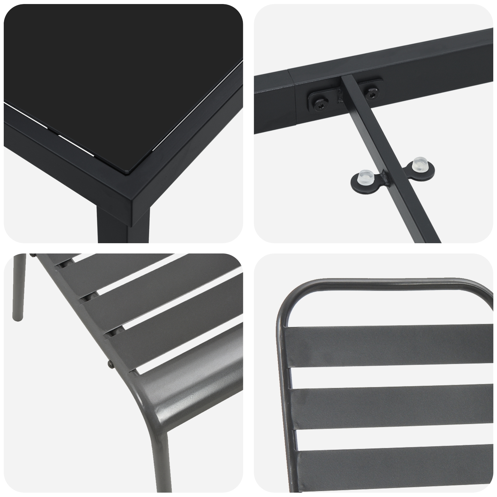 - Construcție din Oțel Vopsit Electrostatic: Fabricat din oțel vopsit electrostatic de calitate, acest set de masă este proiectat special pentru durabilitate și longevitate. Rezistent la expunerea la UV și la vreme, setul își menține robustețea și atractivitatea estetică în diferite condiții de exterior. Construcția sa solidă asigură locuri de ședere fiabile, fiind perfect pentru utilizare frecventă și ocazii sociale.