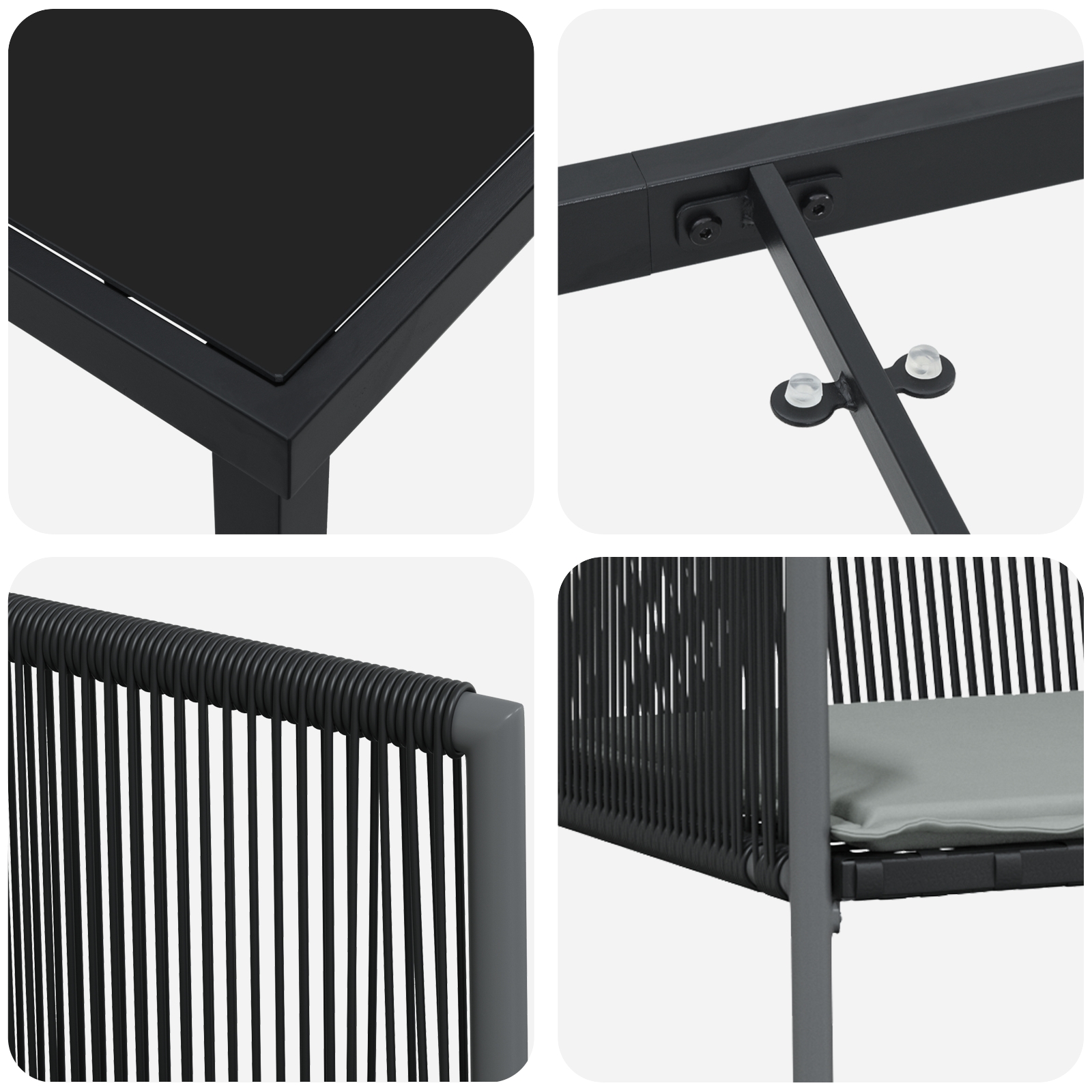 - Integrarea Componentelor: Setul de patio vine cu un blat din sticlă securizată care adaugă un pic de clasă și utilitate. Pernele au fermoare pentru curățare simplă și cu picioarele din oțel vopsit electrostatic, e solid și stabil, așa că te poți bucura de întâlnirile tale afară fără griji. Fiecare material e ales să îmbunătățească confortul și stilul.