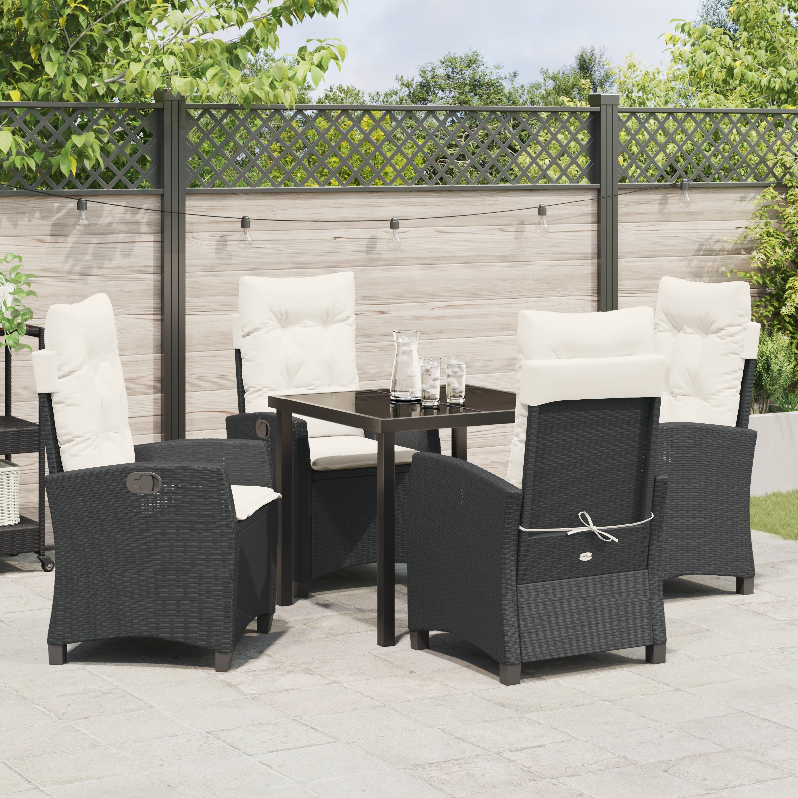 - Componente Incluse: Setul vine cu scaune care se pot reclina, astfel că îți poți ajusta nivelul de confort exact cum îți place. Scaunele din ratan sunt solide, dar și foarte confortabile. Cotierile se potrivesc cu scaunele, sporind stilul și confortul. Blatul de sticlă arată superb și îți îmbunătățește experiența de masă.
