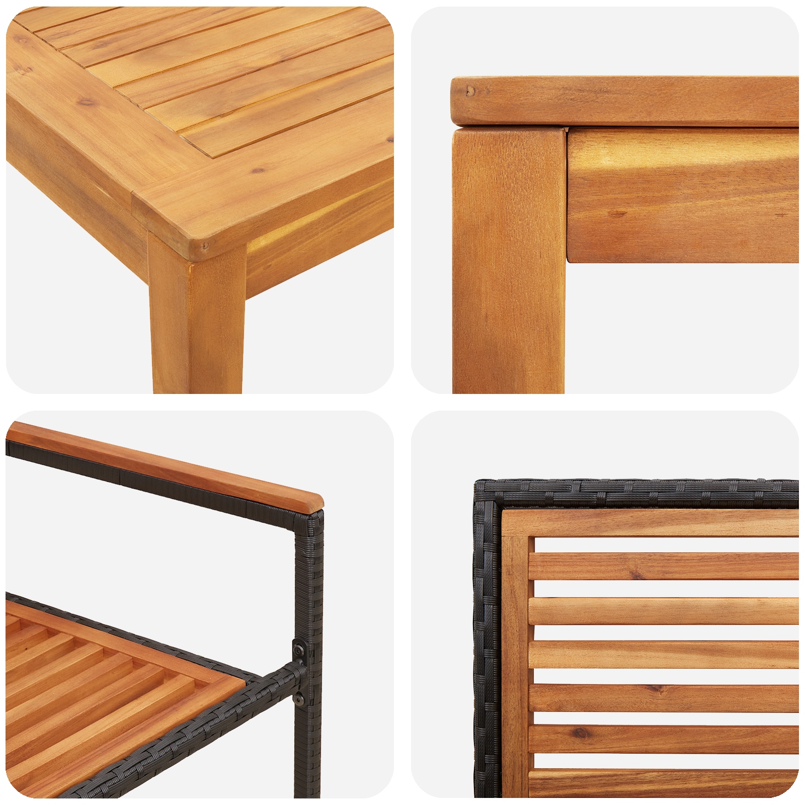 - Componente Funcționale Setul include o masă rectangulară, scaune cu șezuturi și spătare din lemn solid de acacia și brațe din poliratan, fiecare lucrat cu atenție la detalii. Aceste componente de înaltă calitate oferă confort și durabilitate, făcând din experiența de a mânca sau de a te relaxa afară una plăcută.