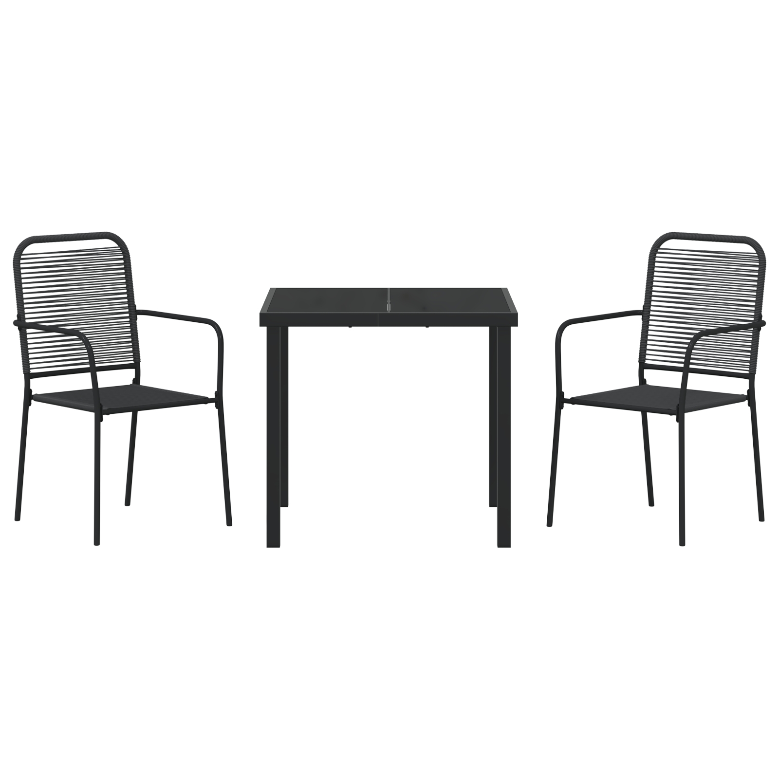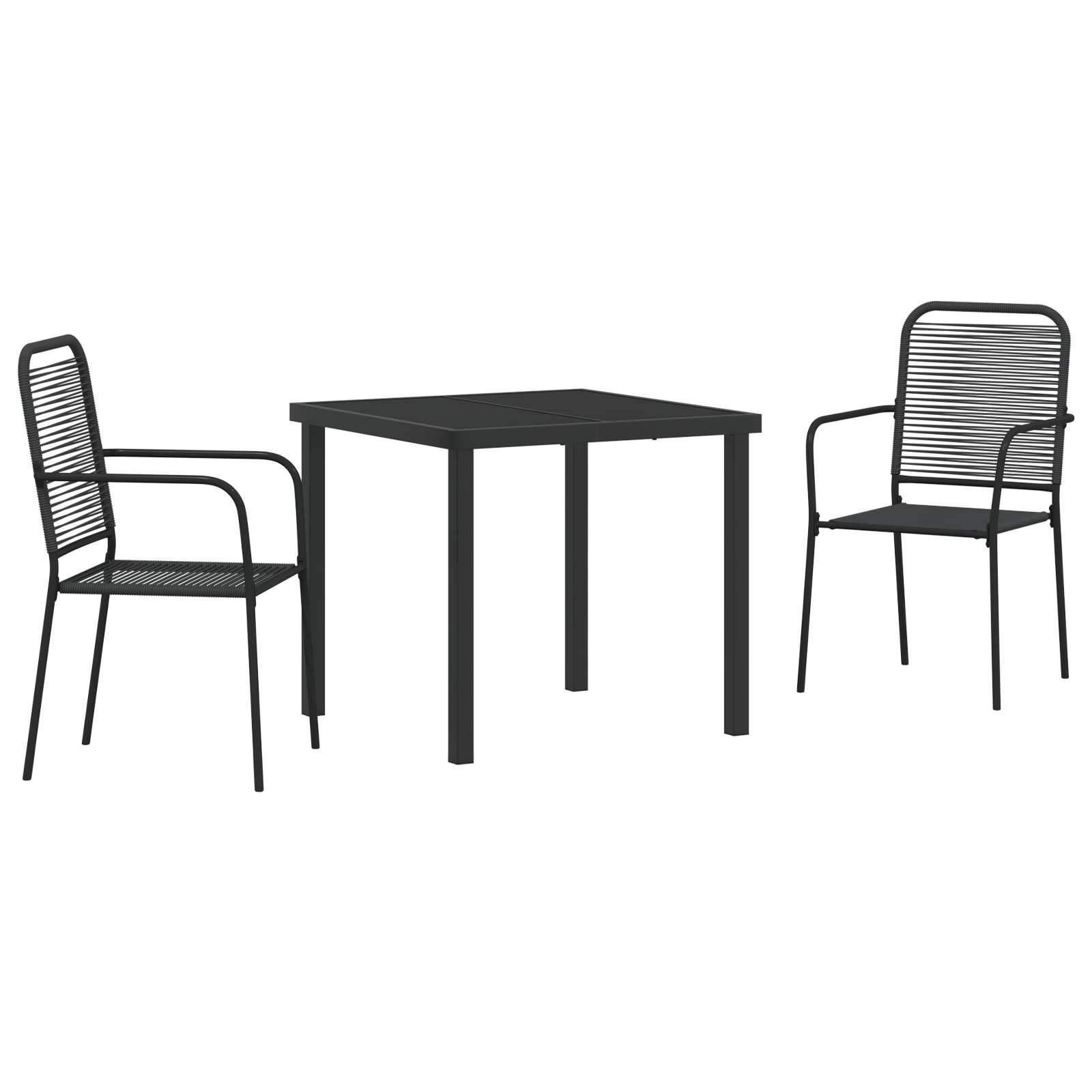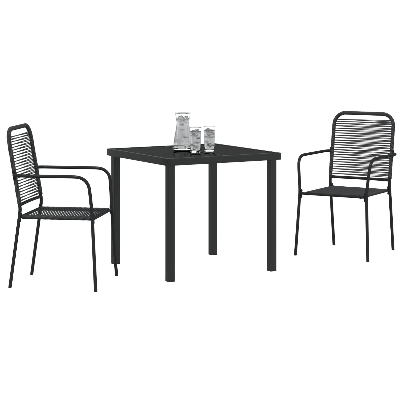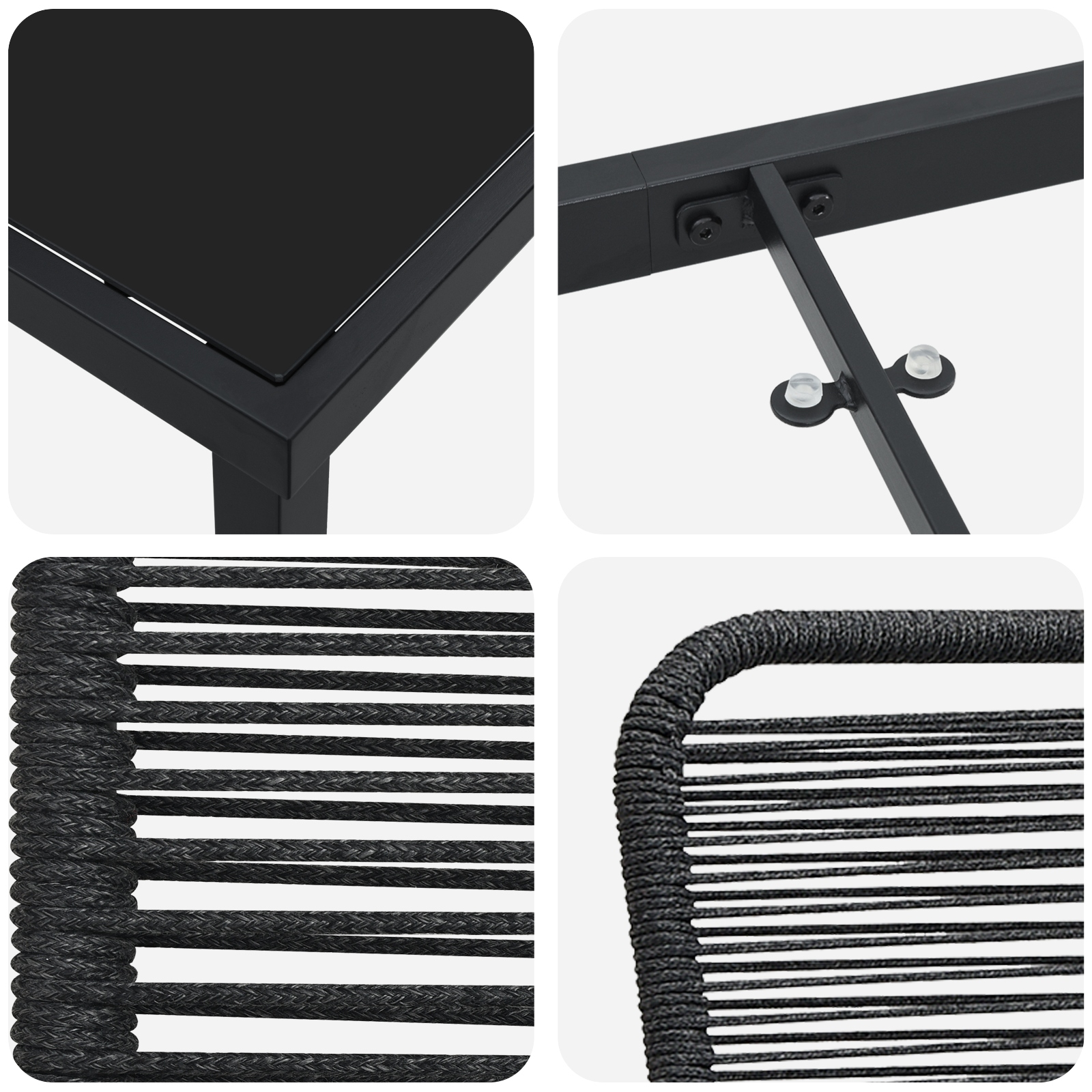 - Combinație de materiale: Fabricat din sfoară de bumbac și oțel vopsit electrostatic, acest set de masă combină farmecul natural cu durabilitatea. Bumbacul dă un aspect moale, dar e robust pentru utilizarea de zi cu zi, iar oțelul asigură o durată lungă de viață, făcându-l o alegere de încredere pentru exterior.