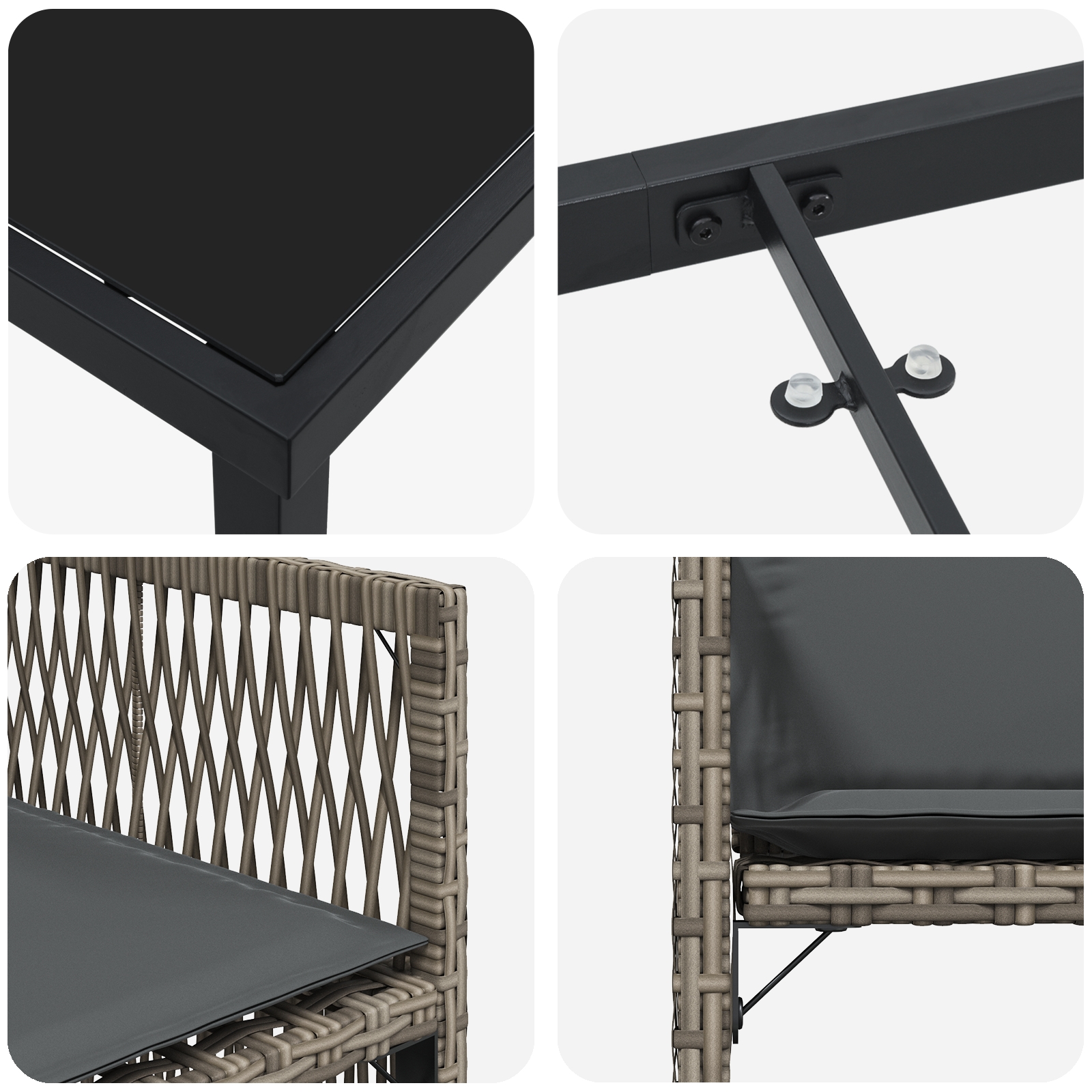 • Componente incluse: Vine cu un blat din sticlă elegant și ușor de curățat după mese. Are spătare și cotiere confortabile din poliratan, gândite pentru momente relaxante. Picioarele robuste îi oferă stabilitate pe suprafețe variate, iar umplutura moale din poliester aduce un plus de confort la fiecare masă.