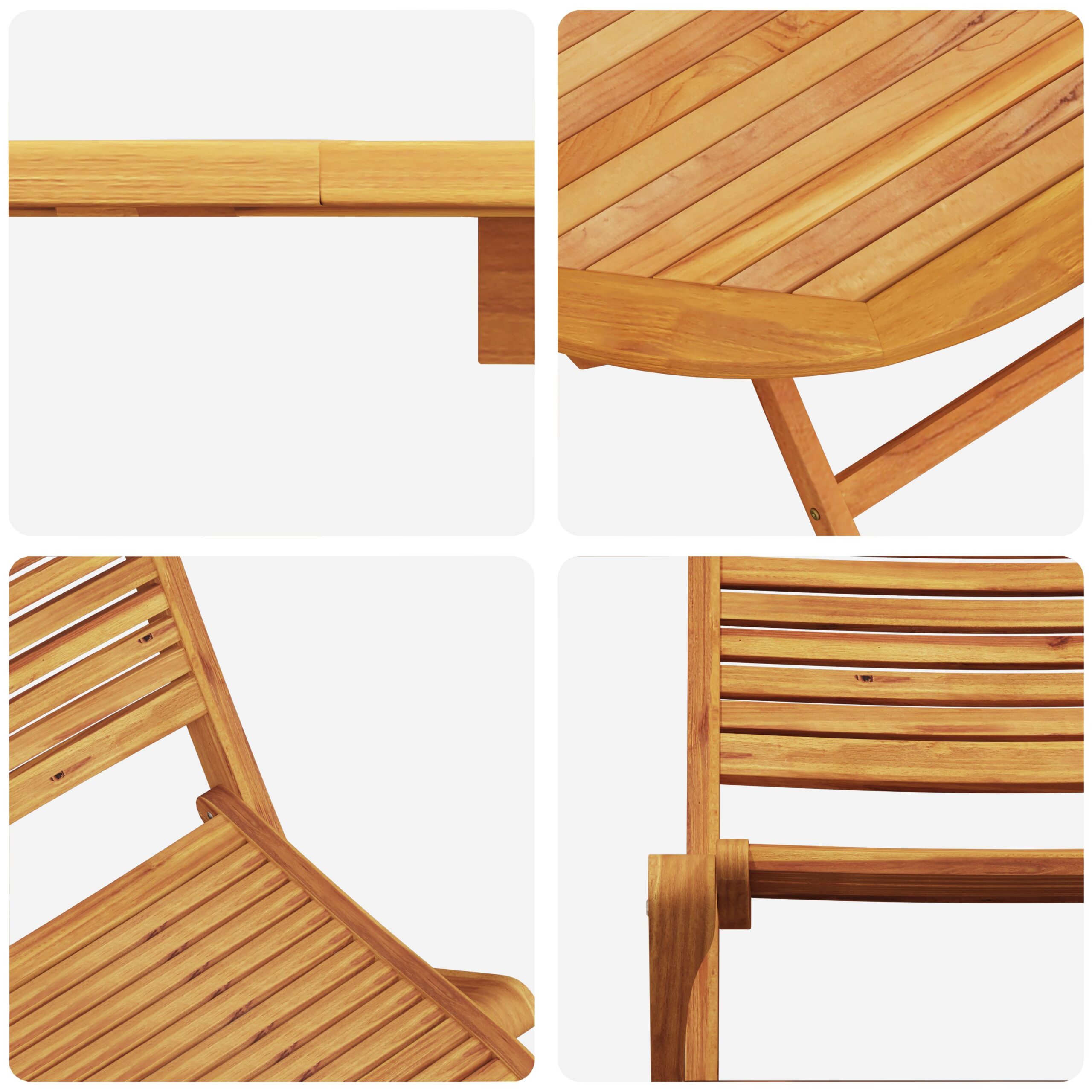 - Componente Funcționale: Setul de grădină include o masă ovală versatilă și scaune ergonomice cu suport pentru spate confortabil. Fiecare componentă, compusă din lemn durabil de acacia, este proiectată să îmbunătățească fiecare experiență în aer liber, asigurând confort și stil.