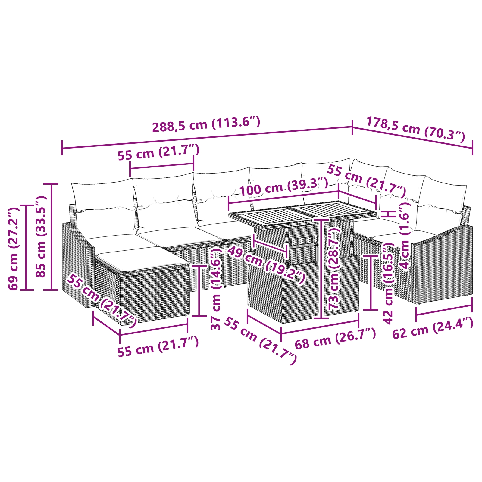- 2 x Canapea cu brațe, inclusiv funcție de depozitare, 1 x Scaun de colț, inclusiv funcție de depozitare, 4 x Scaun central, inclusiv funcție de depozitare, 1 x Taburet cu funcție de depozitare, 1 x Masă de grădină
