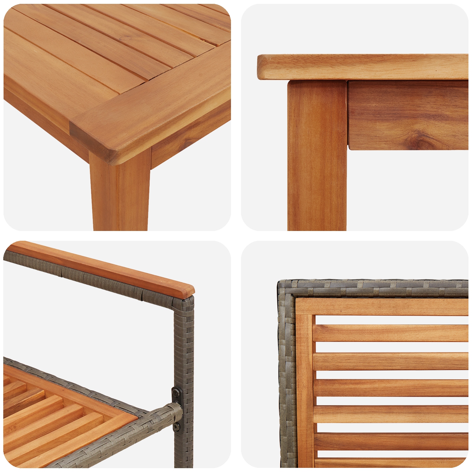 - Componente Funcționale Setul include o masă rectangulară, scaune cu șezuturi și spătare din lemn solid de acacia și brațe din poliratan, fiecare lucrat cu atenție la detalii. Aceste componente de înaltă calitate oferă confort și durabilitate, făcând din experiența de a mânca sau de a te relaxa afară una plăcută.