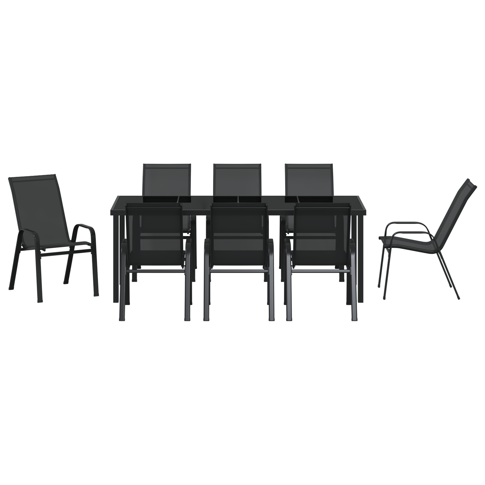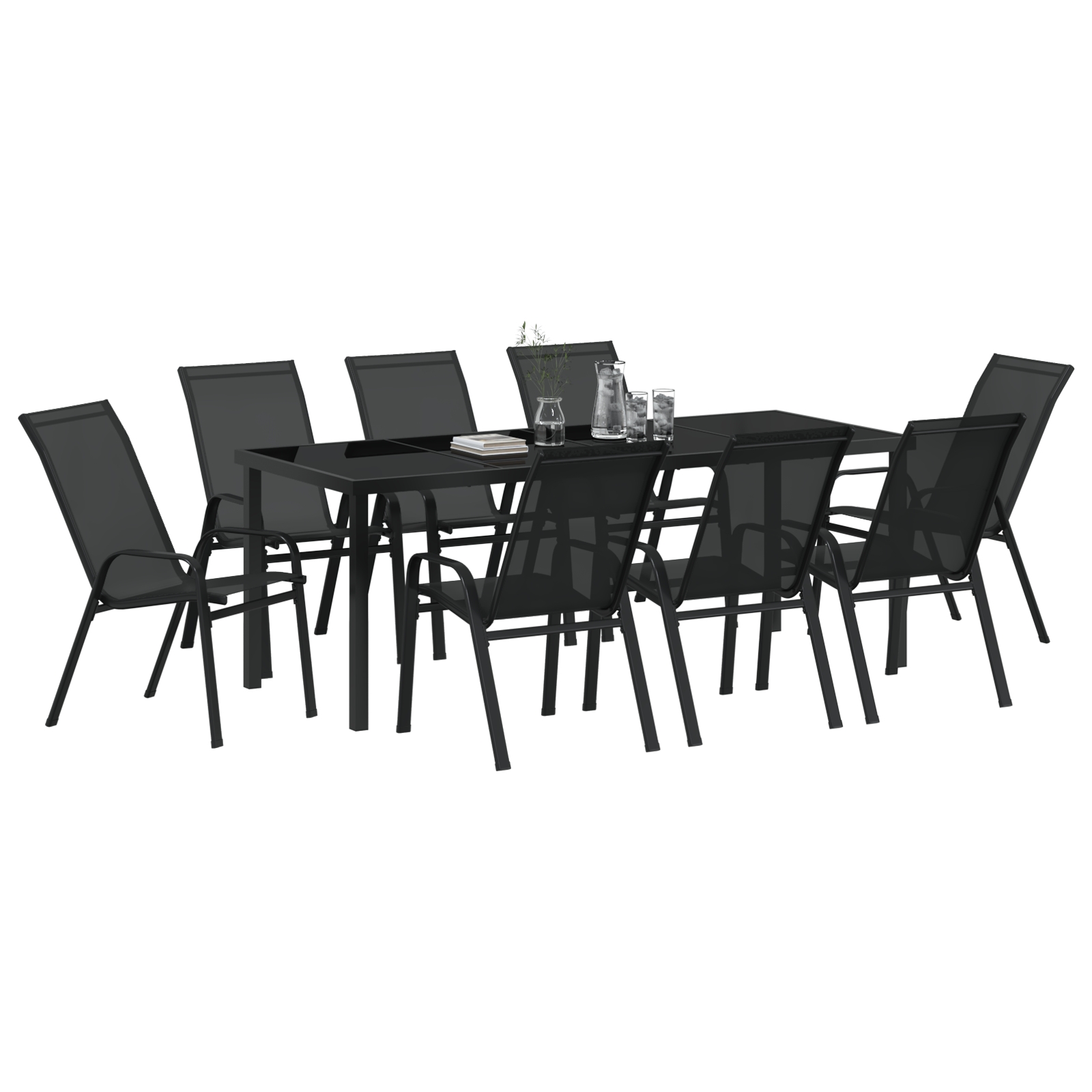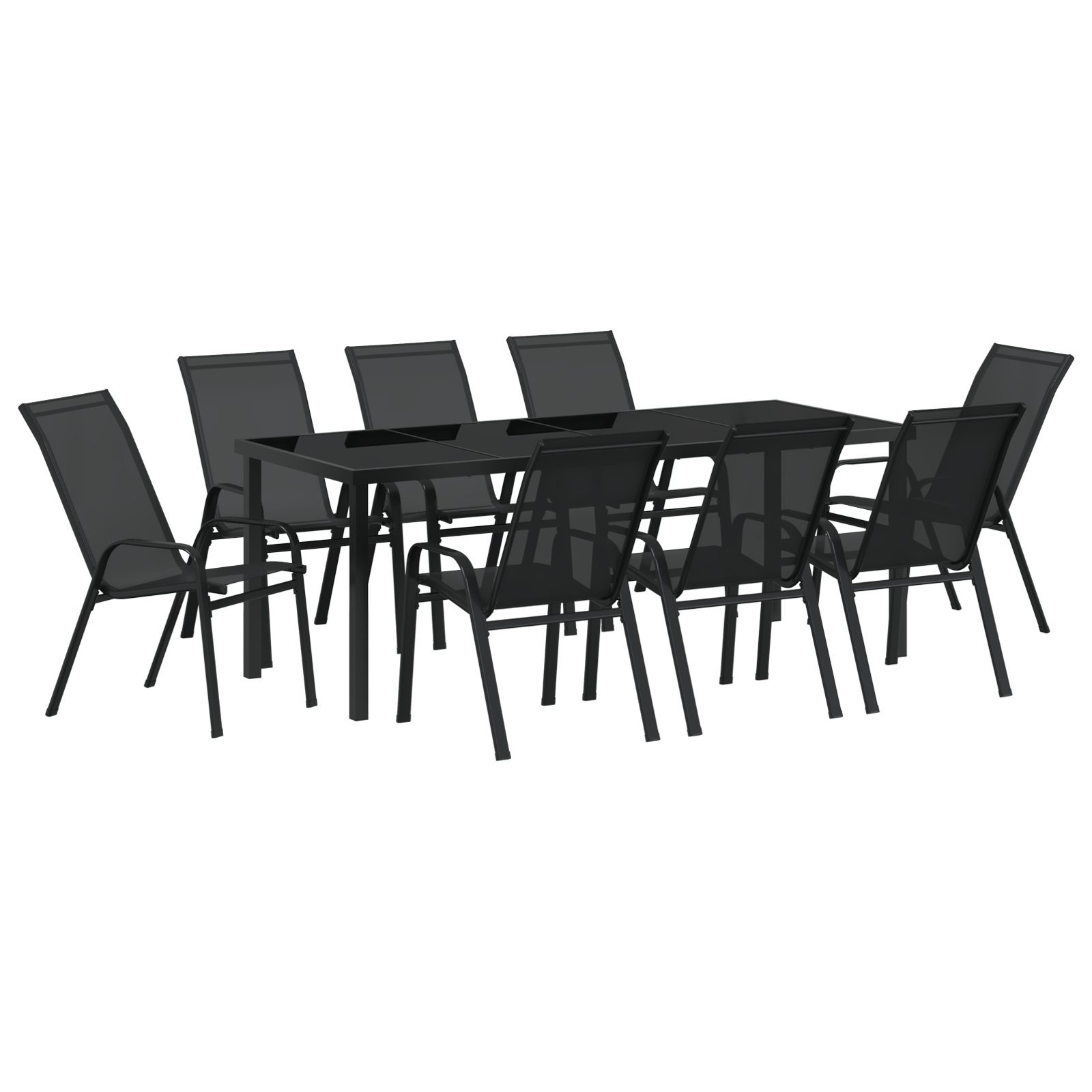 Set de dining pentru grădină cu 9 piese Negru și Textilenă, Masă de grădină Neagră 200x80x73 cm cu Sticlă