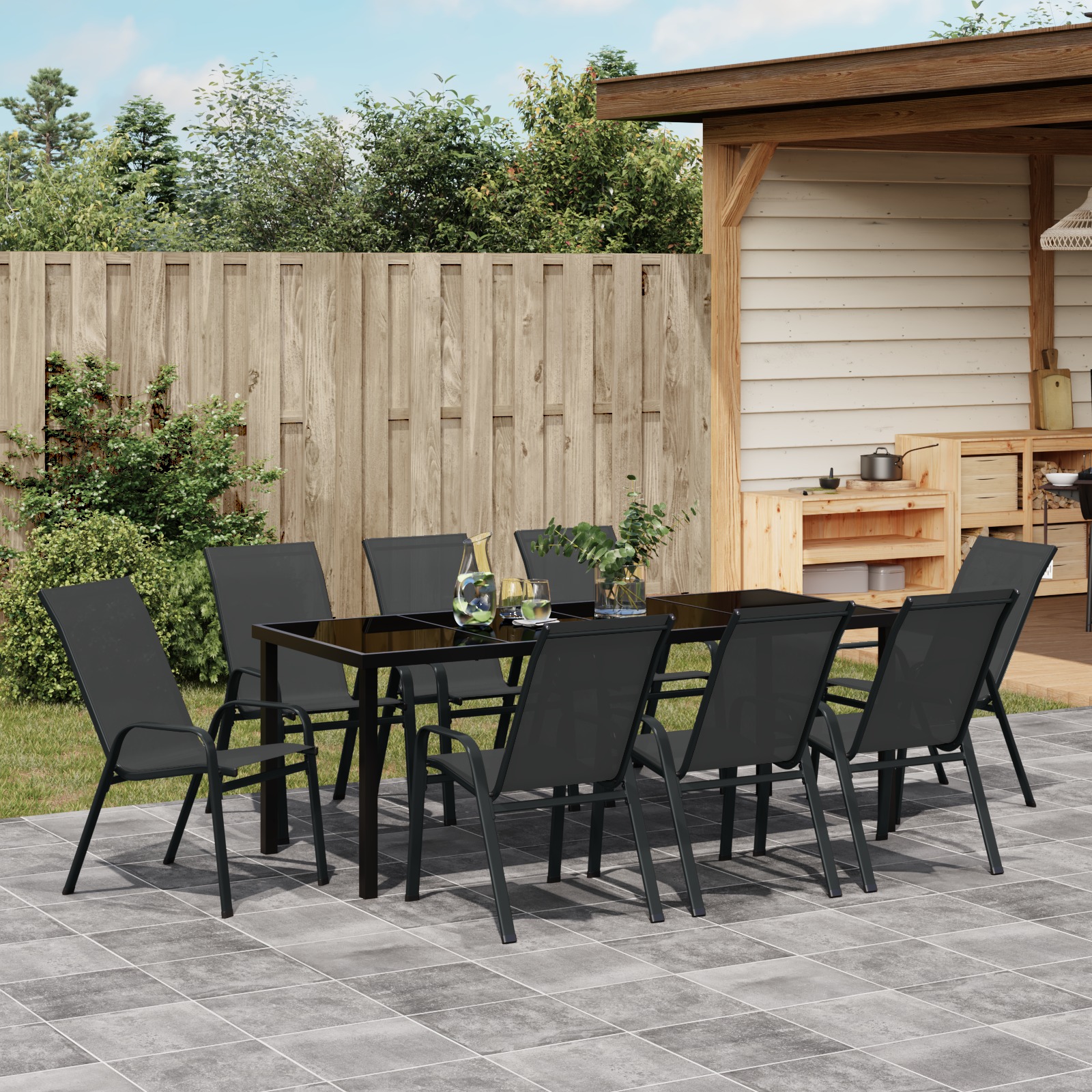 Îmbunătățește-ți mesele afară cu setul de dining pentru grădină cu 9 piese, amestecând stilul cu utilitatea. Acest set modern din oțel negru și textilenă oferă mult loc pentru întâlniri mari și e perfect pentru a te bucura de mese în aer liber.