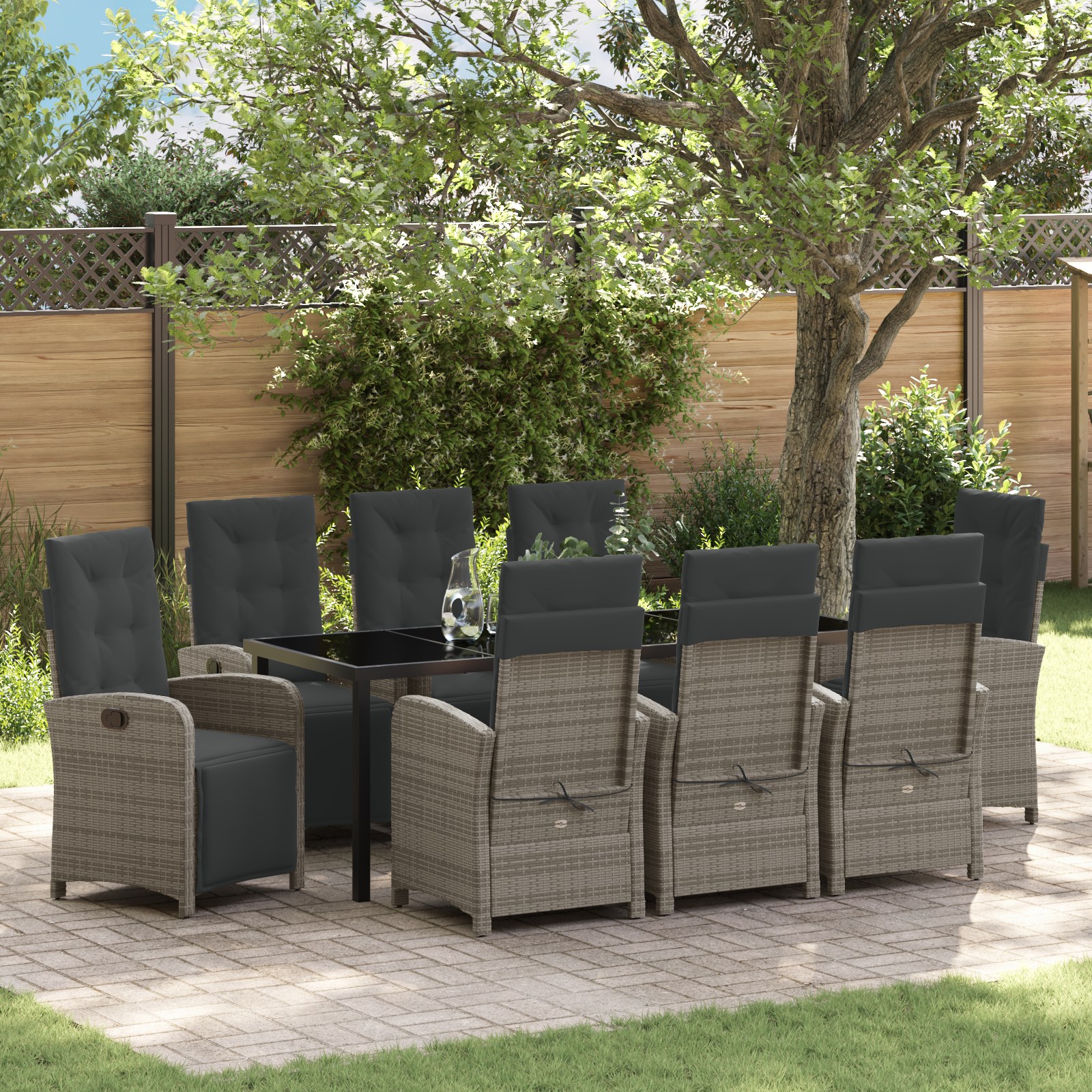 Set de dining pentru grădină cu 9 piese și perne gri din ratan poli, Masă de grădină neagră 200x80x73 cm din sticlă securizată