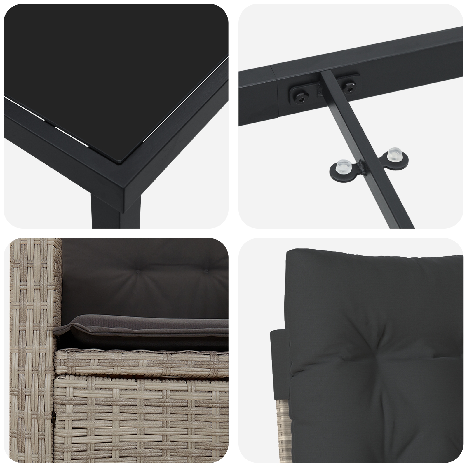 - Materiale: Setul ăsta e fabricat dintr-un amestec stylish de ratan, oțel și sticlă. Ratanul arată tare bine și e rezistent la vreme, oțelul îi dă stabilitate, iar blatul din sticlă e elegant și ușor de curățat. Combinarea asta înseamnă că va rezista și va fi pătruns de stil mulți ani, gata să facă față ploii sau după-amiezelor însorite.