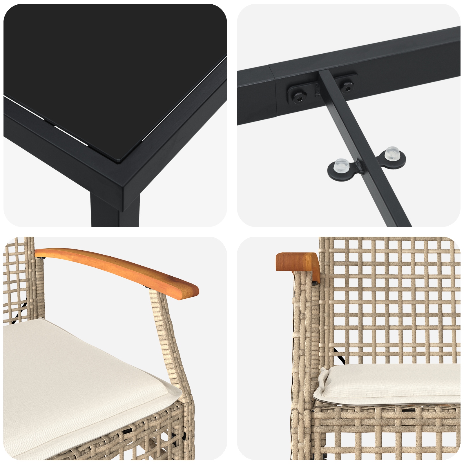 - Materiale Rezistente: Combinarea asta faină de lemn solid de acacia face ca setul tău să reziste la toate petrecerile de vară. Textura naturală a lemnului adaugă un strop de eleganță, iar scaunele din poliratan sunt atât comfy, cât și stilate. Plus, suprafața din sticlă neagră aduce un pic de rafinament oricărei mese sau întâlniri.