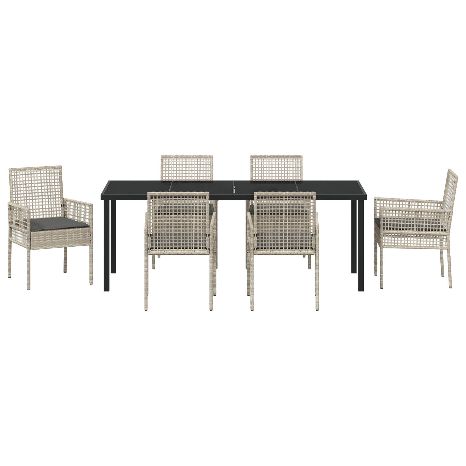 Setul ăsta de dining pentru grădină aduce o vibrație fresh de confort și stil, devenind un punct central tare pentru mesele tale afară. Include o masă dreptunghiulară și șase scaune frumos concepute, care îmbină perfect gri deschis cu gri închis, sporind aspectul oricărui patio, terasă sau balcon.