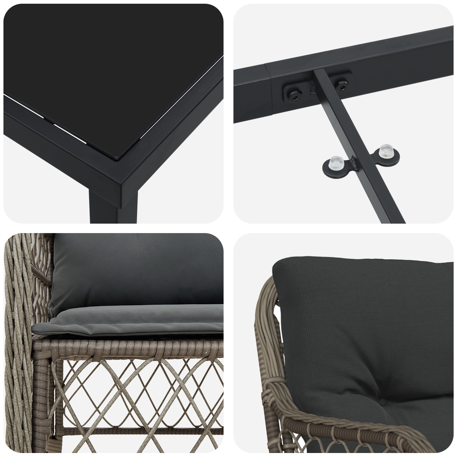 Setul ăsta super de dining pentru grădină e fix ce-ți trebuie dacă îți place stilul modern și eleganța practică. E perfect pentru mese al fresco cu familia sau prietenii, designul său șmecher și amestecul de texturi aduc o notă de clasă grădinii sau terasei tale. E nu doar frumos, ci și bine făcut, ca să facă față vremii.