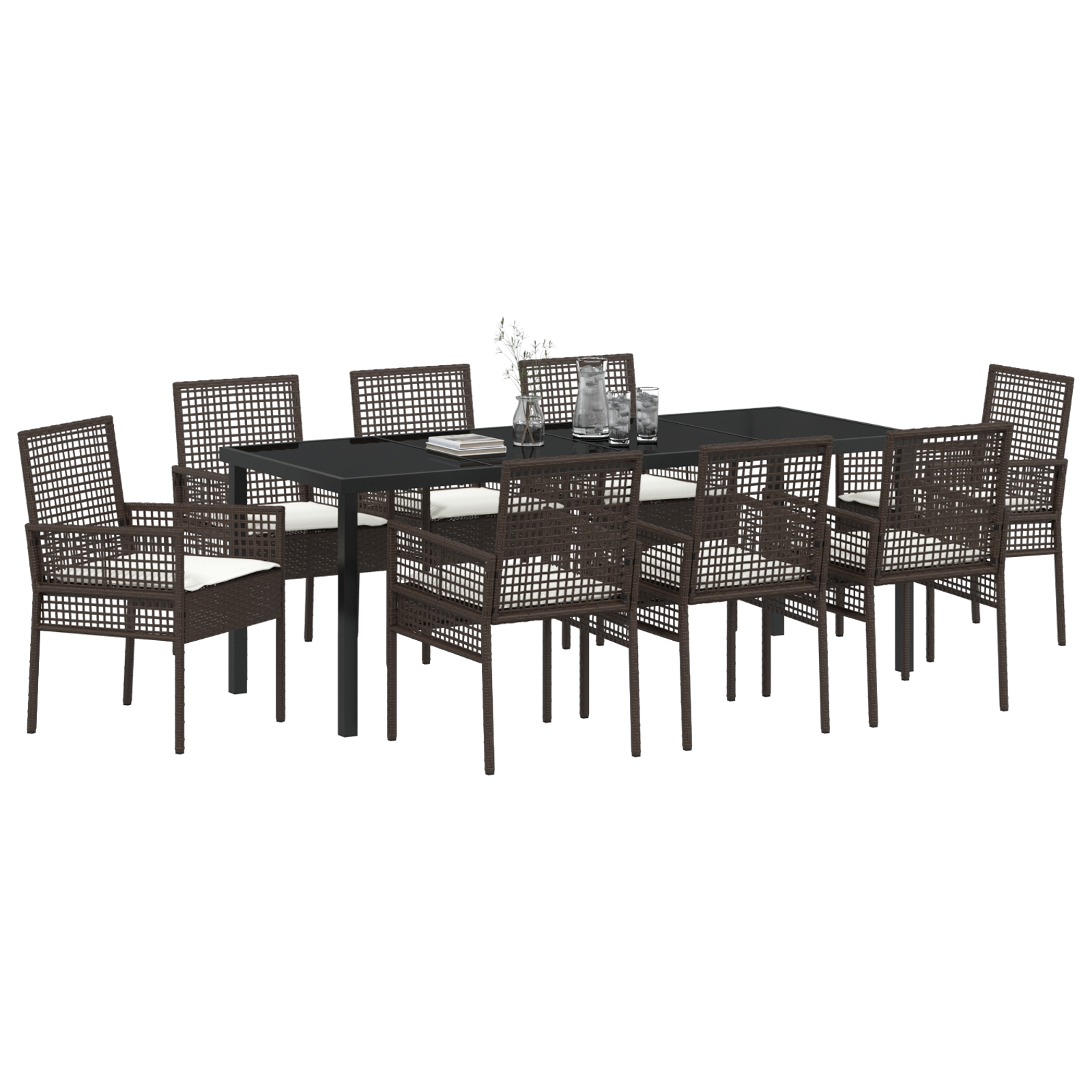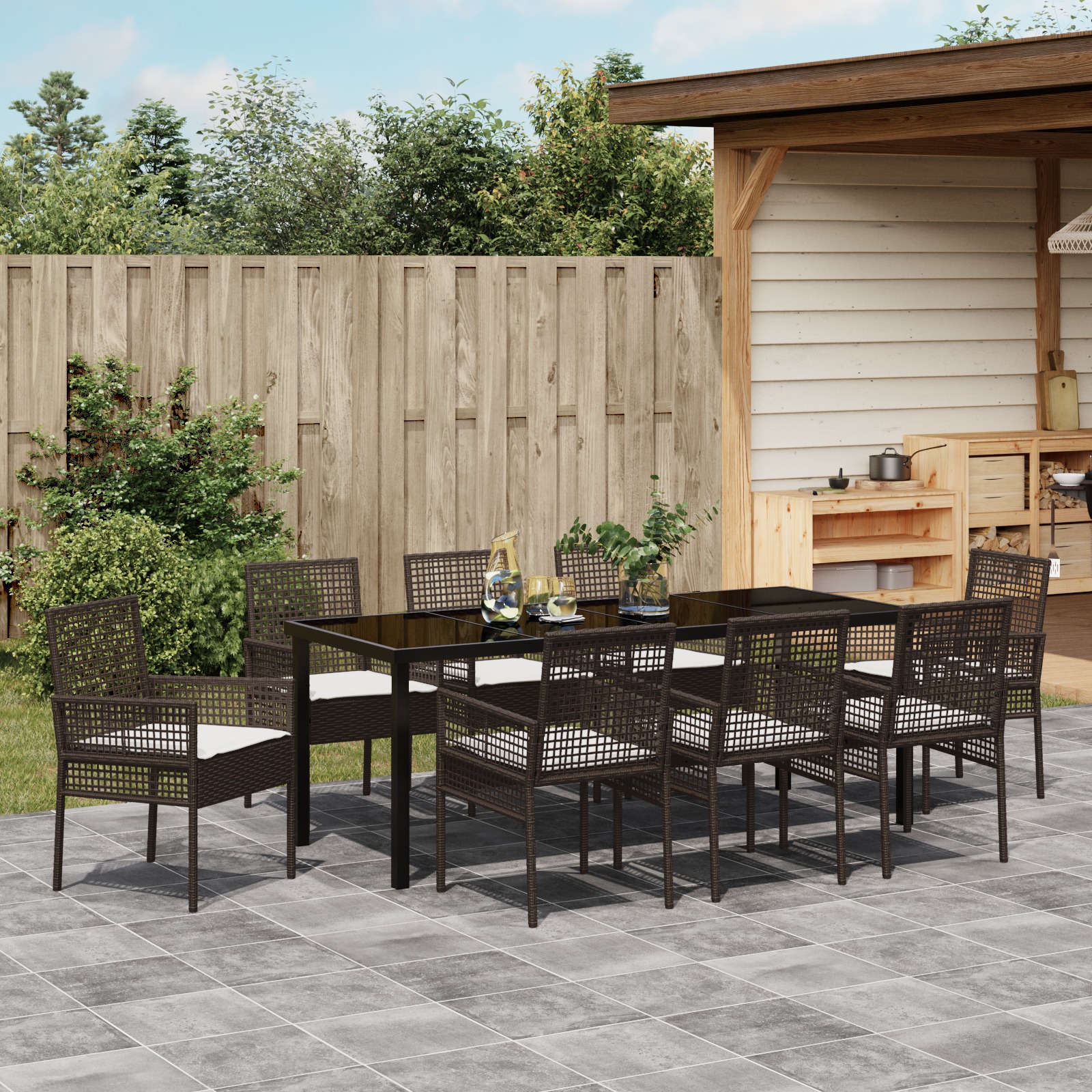 Acest set de dining pentru grădină, cu un stil modern și multe locuri, e creat pentru confort și aspect plăcut. Vino cu 8 scaune frumos făcute și o masă rectangulară mare, cu o combinație chic de culori maro și crem, care îmbunătățește orice grădină sau balcon.