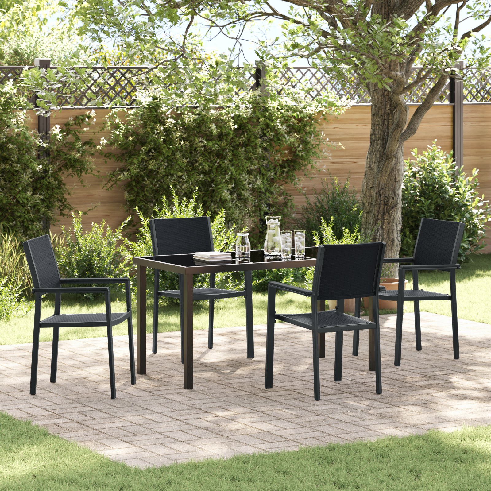 - Design trendy: Ramele din oțel vopsit electrostatic adaugă o notă chic, iar blatul din sticlă securizată e perfect pentru băuturi și gustări. E super primitor, făcându-ți spațiul exterior ca acasă.