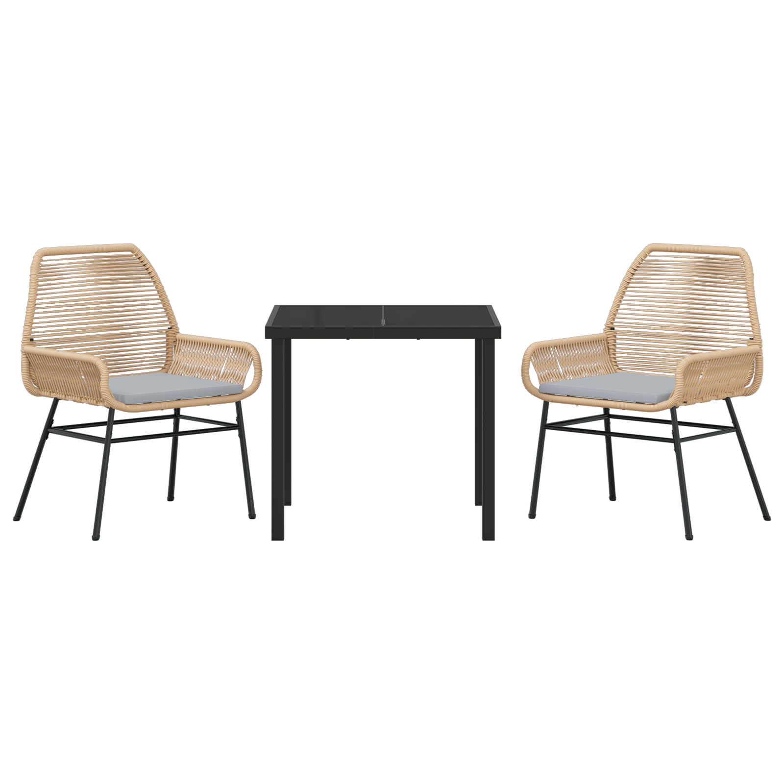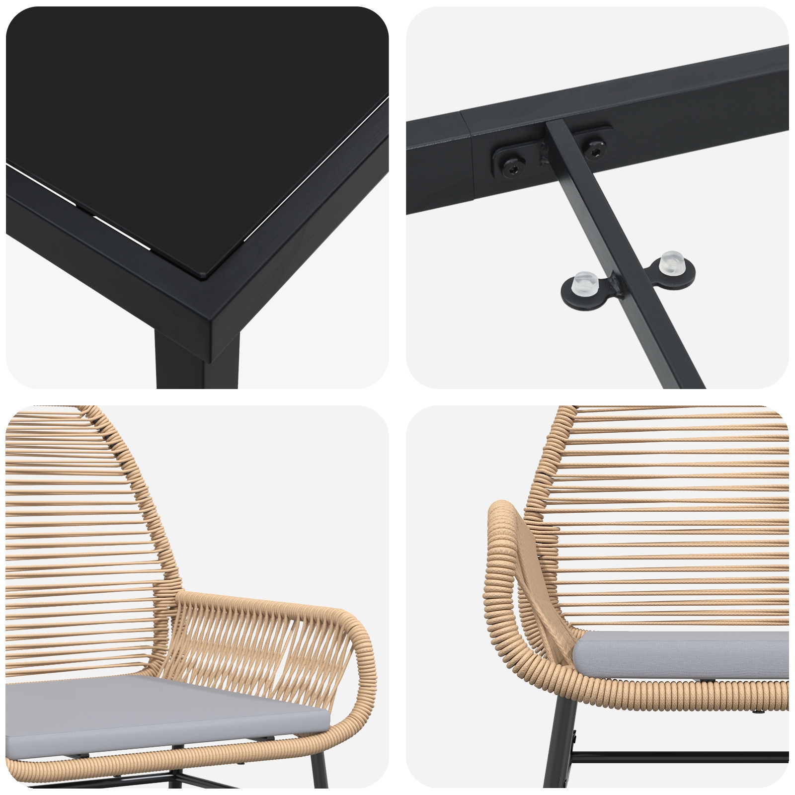 - Componente complete: Fiecare scaun are cotieră și spătar din poliratan confortabil pentru un plus de stil și confort. Blatul de sticlă e perfect pentru mesă și e ușor de curățat după utilizare. Această combinație de materiale îți oferă un set elegant, care funcționează bine pentru orice ocazie, îmbunătățindu-ți experiența în aer liber.