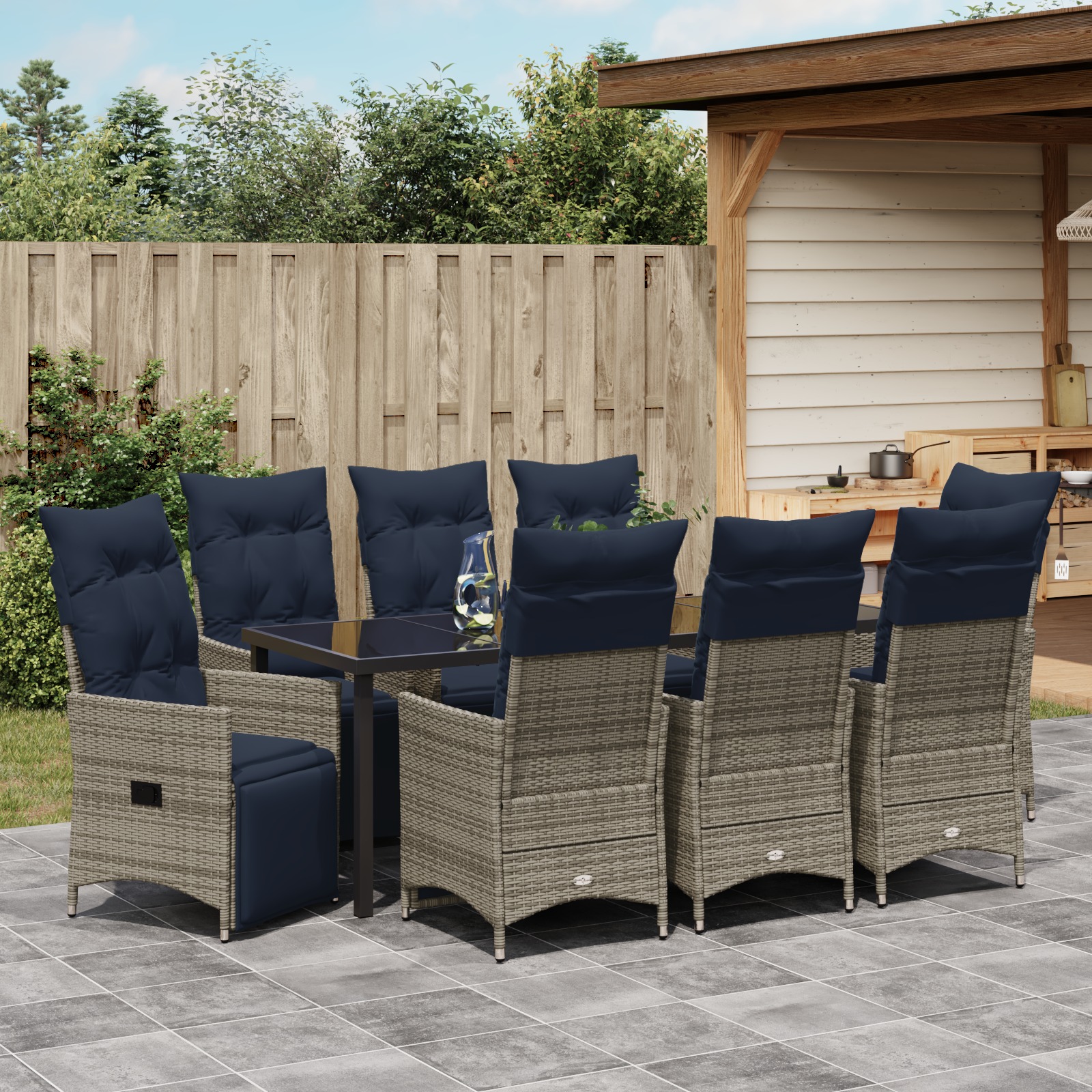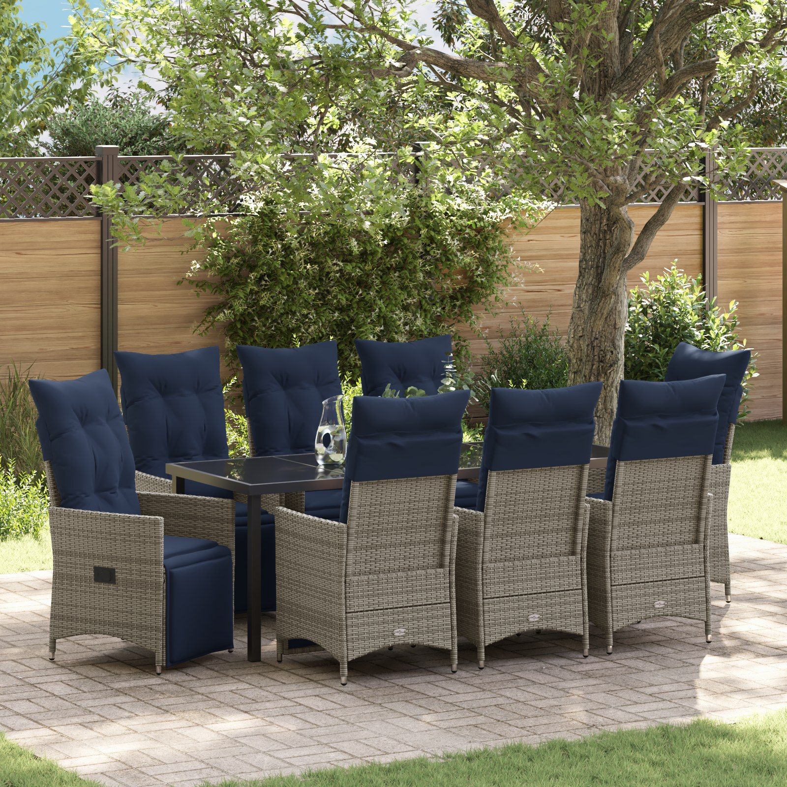 Acest set de dining pentru grădină în 9 piese e creat pentru adunări mari, având un aspect modern care se potrivește oricărui spațiu în aer liber. Are o masă dreptunghiulară spațioasă și 8 scaune confortabile, fiecare cu perne moale bleumarin, asigurându-se că toată lumea se simte bine la mese.
