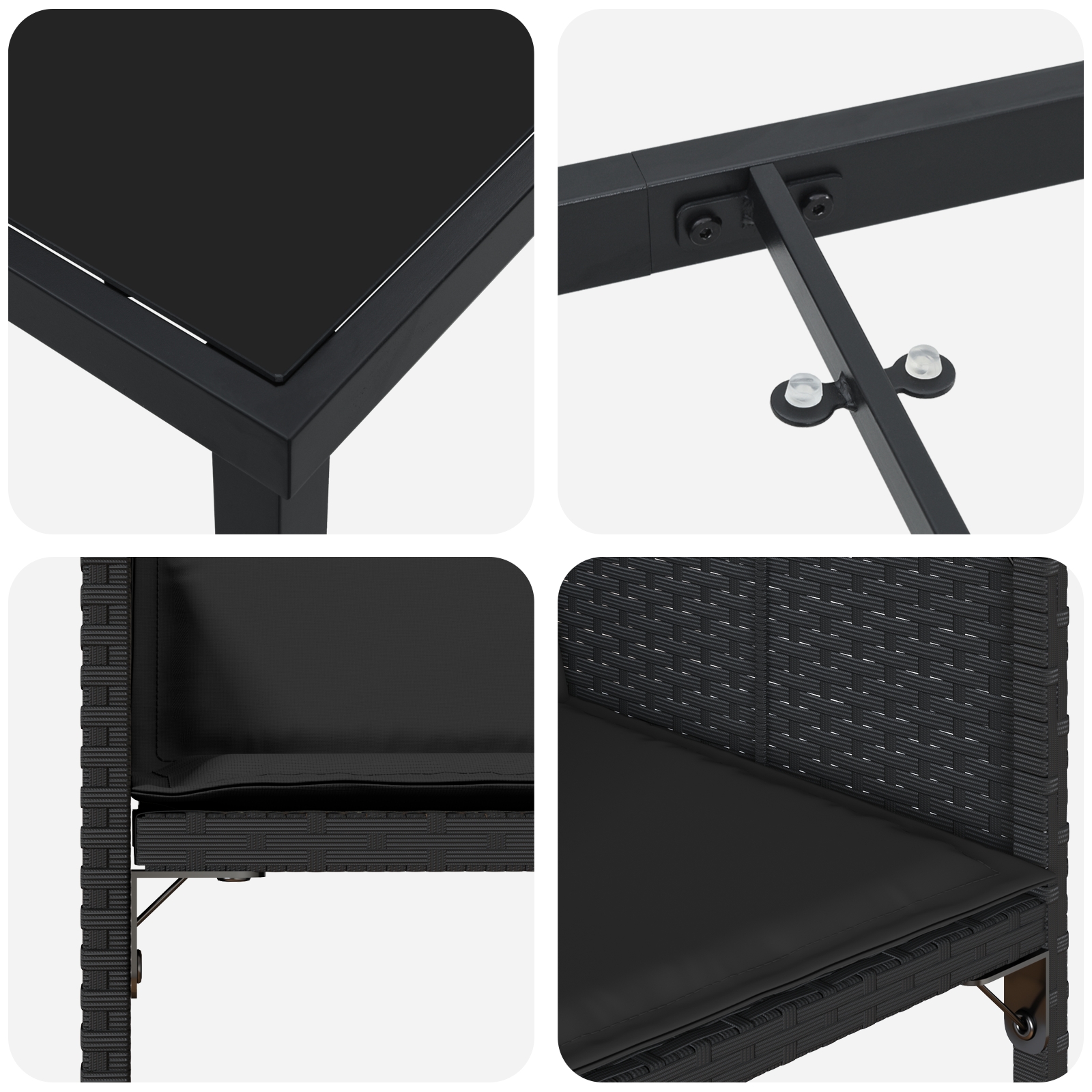 • Materiale: Făcut din poliratan de calitate superioară, cu un design împletit de mână care arată bine și durează. Cadrul robust din oțel vopsit nu se va rugini și e fiabil indiferent de vreme. Blatul din sticlă securizată arată bine și e ușor de curățat, făcând să fie un element stylish în grădina ta.