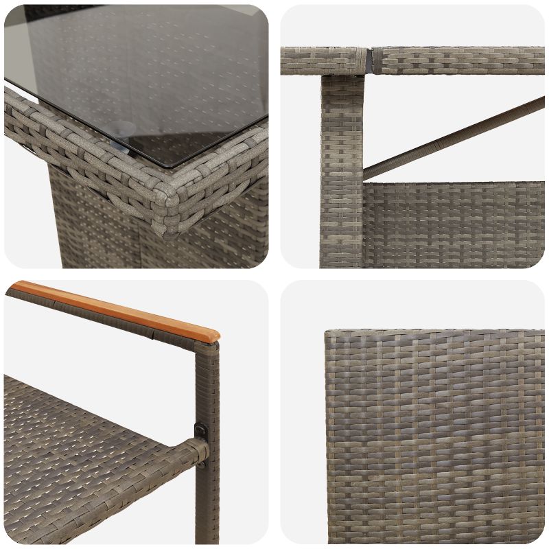 • Materiale: Făcut în principal din poliratan de calitate superioară, e cunoscut pentru rezistența și confortul său. Oțelul vopsit electrostatic din cadru adaugă stabilitate și un aspect elegant. Materialele de calitate asigură că va rezista bine, fiind o achiziție inteligentă pentru terasa ta.