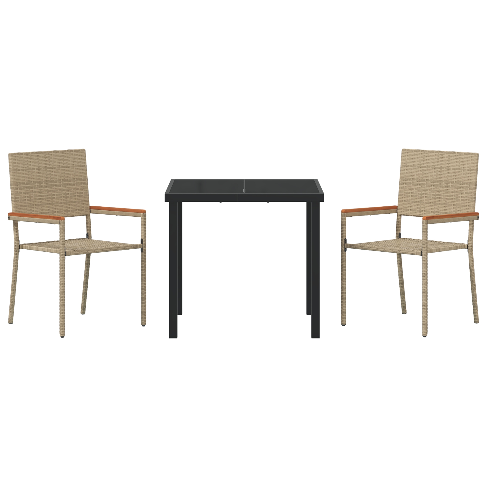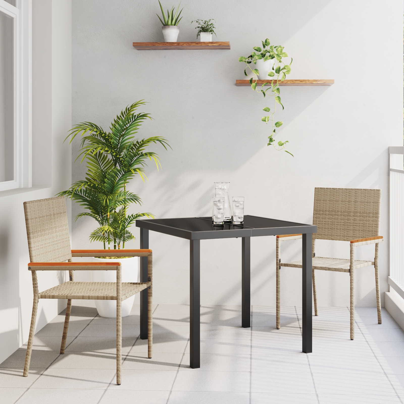 - Componente Incluse: Fiecare piesă de mobilier are spătare din poliratan, cadre din oțel și mese din sticlă securizată, ca să arate bine și să fie durabile. Cotierile din lemn masiv de acacia adaugă un pic de farmec și oferă suport.