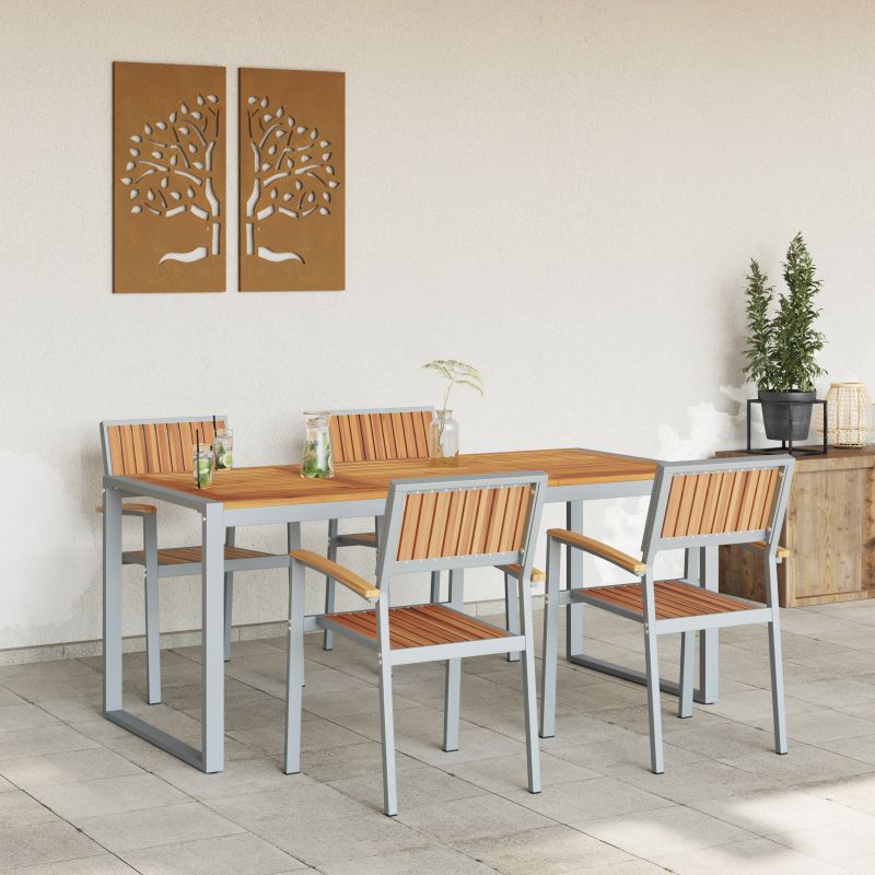 - Componente: Setul include brațe din lemn de acacia masiv, care adaugă căldură și stil. Picioarele solide din oțel oferă suport bun, asigurându-te că ești în siguranță și confortabil cât stai. Finisajul bogat de culoare maro leagă totul, dând un aspect plăcut care se potrivește bine cu orice decor de exterior.