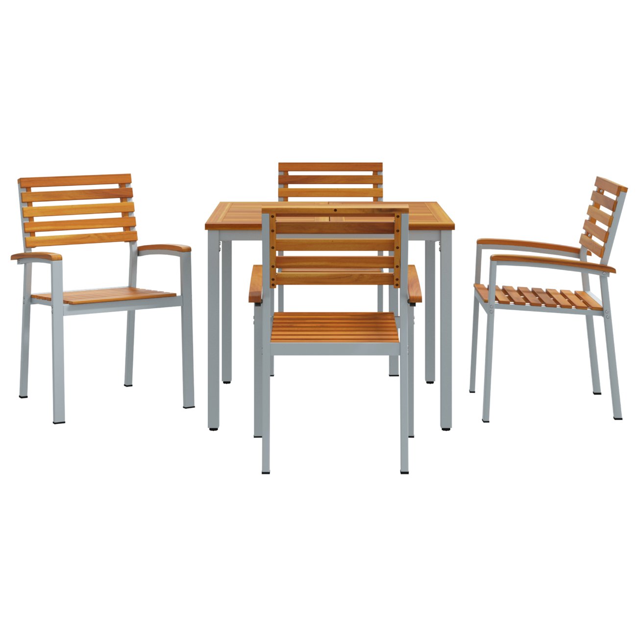 - Componente incluse: Setul vine cu o masă spațioasă și multe scaune asortate, toate având brațe confortabile din lemn de acacia. Picioarele din oțel oferă stabilitate, așa că se comportă bine pe diverse suprafețe din grădina ta sau pe terasă.