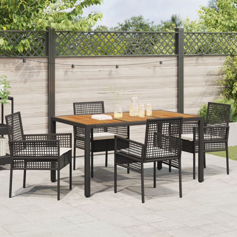 • Materiale: Fabricat din poliratan, setul ăsta de dining arată bine și e tare rezistent. Poliratanul a fost ales pentru că face față vremii urâte, păstrându-se frumos și structurat pe parcursul sezonului. Materialul asta aduce un vibe modern și texturat în grădina ta, fiind în același timp flexibil și prevenind crăpăturile.