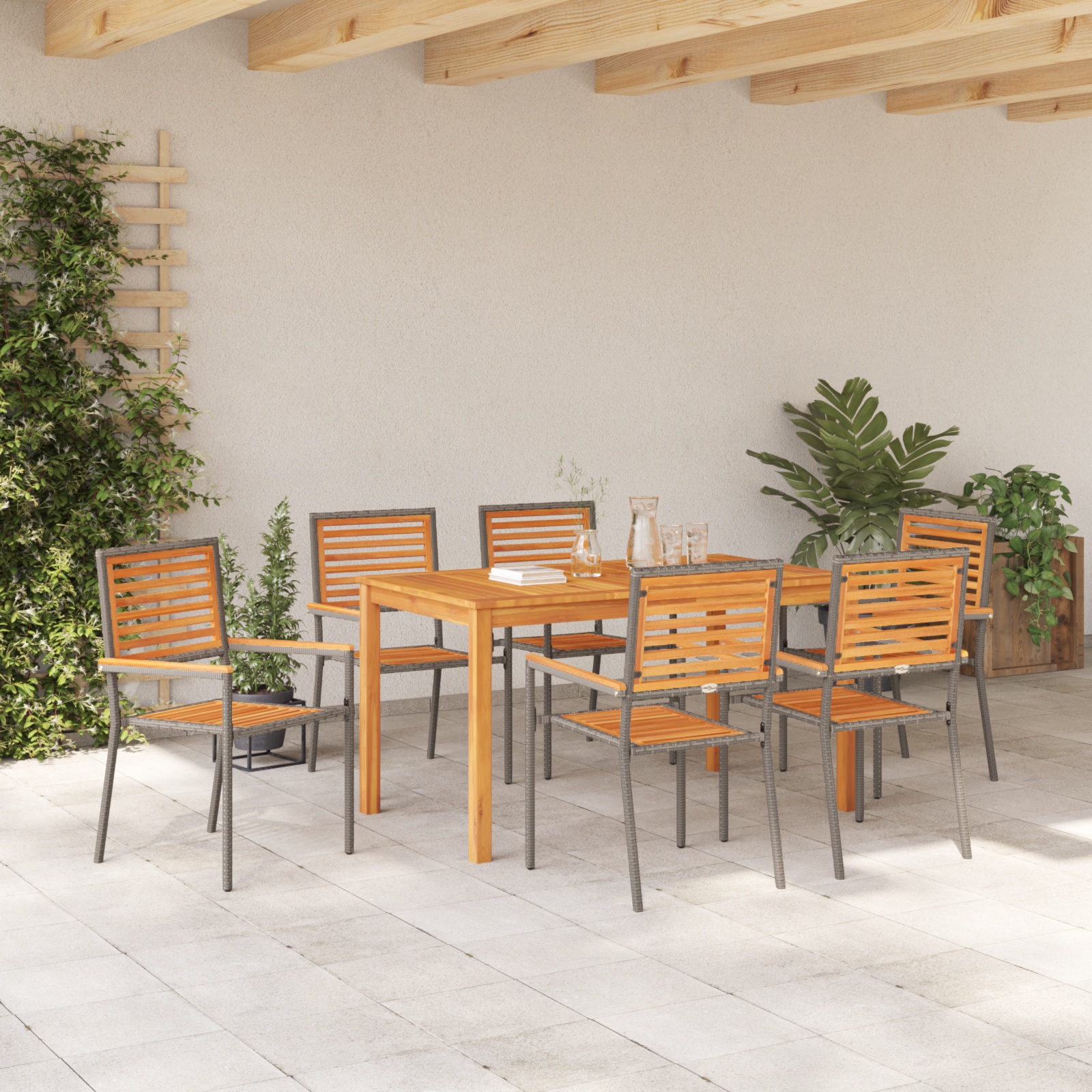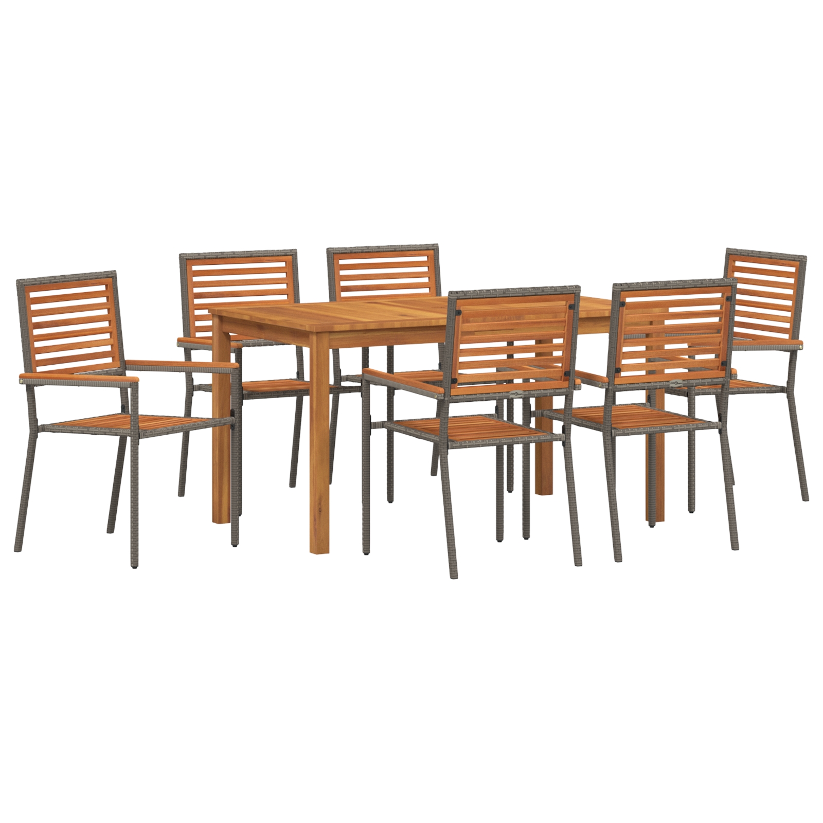 - Componente Funcționale Setul include o masă rectangulară, scaune cu șezuturi și spătare din lemn solid de acacia și brațe din poliratan, fiecare lucrat cu atenție la detalii. Aceste componente de înaltă calitate oferă confort și durabilitate, făcând din experiența de a mânca sau de a te relaxa afară una plăcută.