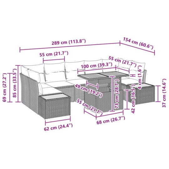- 2 x canapea laterală cu funcție de depozitare, 2 x loc de colț cu funcție de depozitare, 3 x loc central cu funcție de depozitare, 1 x masă de grădină