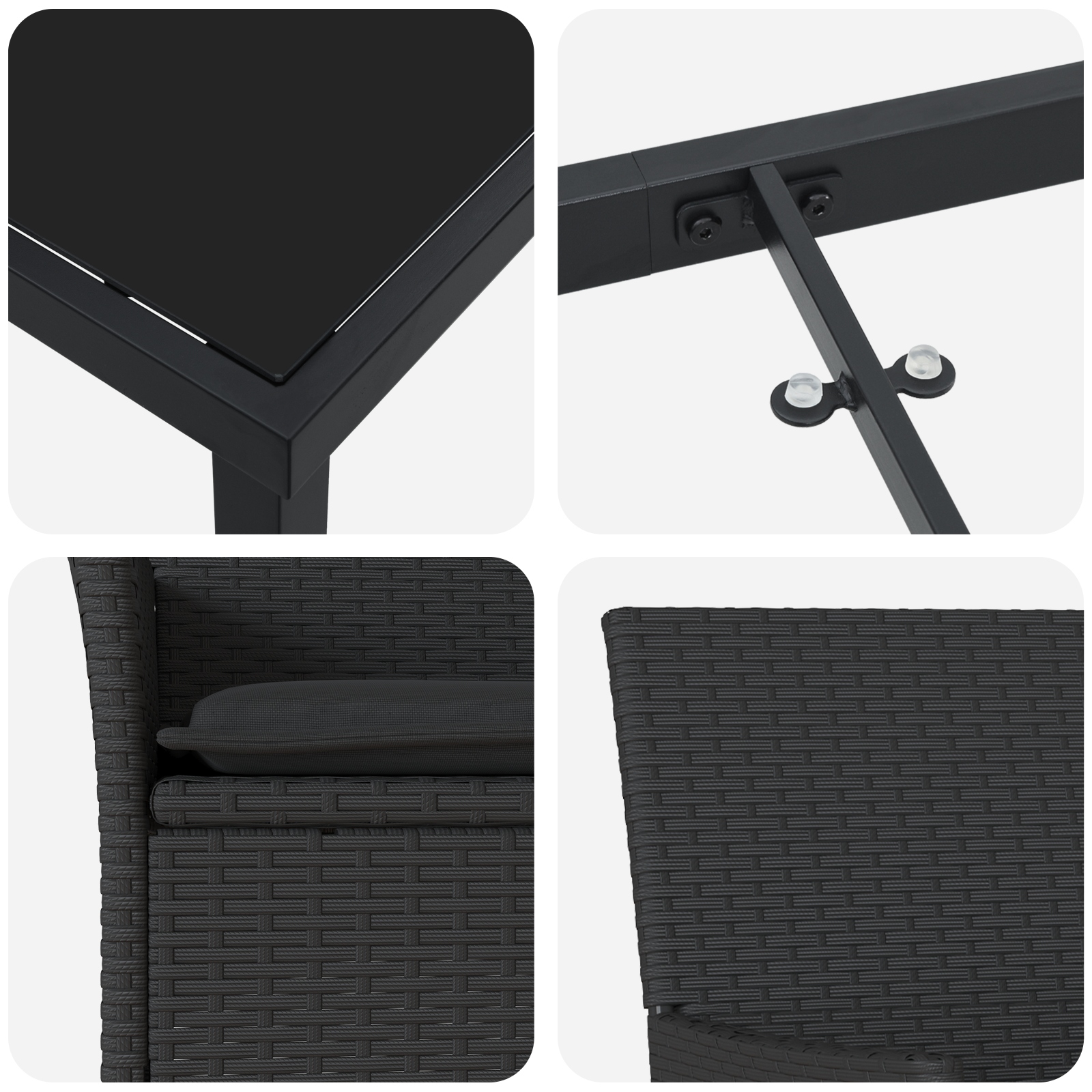 - Poliratan împletit: Setul dispune de o textură fin împletită din poliratan, care nu doar adaugă un strop de eleganță, ci și îmbunătățește durabilitatea. Poliratanul este ales pentru rezistența sa excepțională la razele UV și la condițiile meteorologice, asigurându-se că setul de masă rămâne vibrant și intact, chiar și sub expunere prelungită în aer liber.