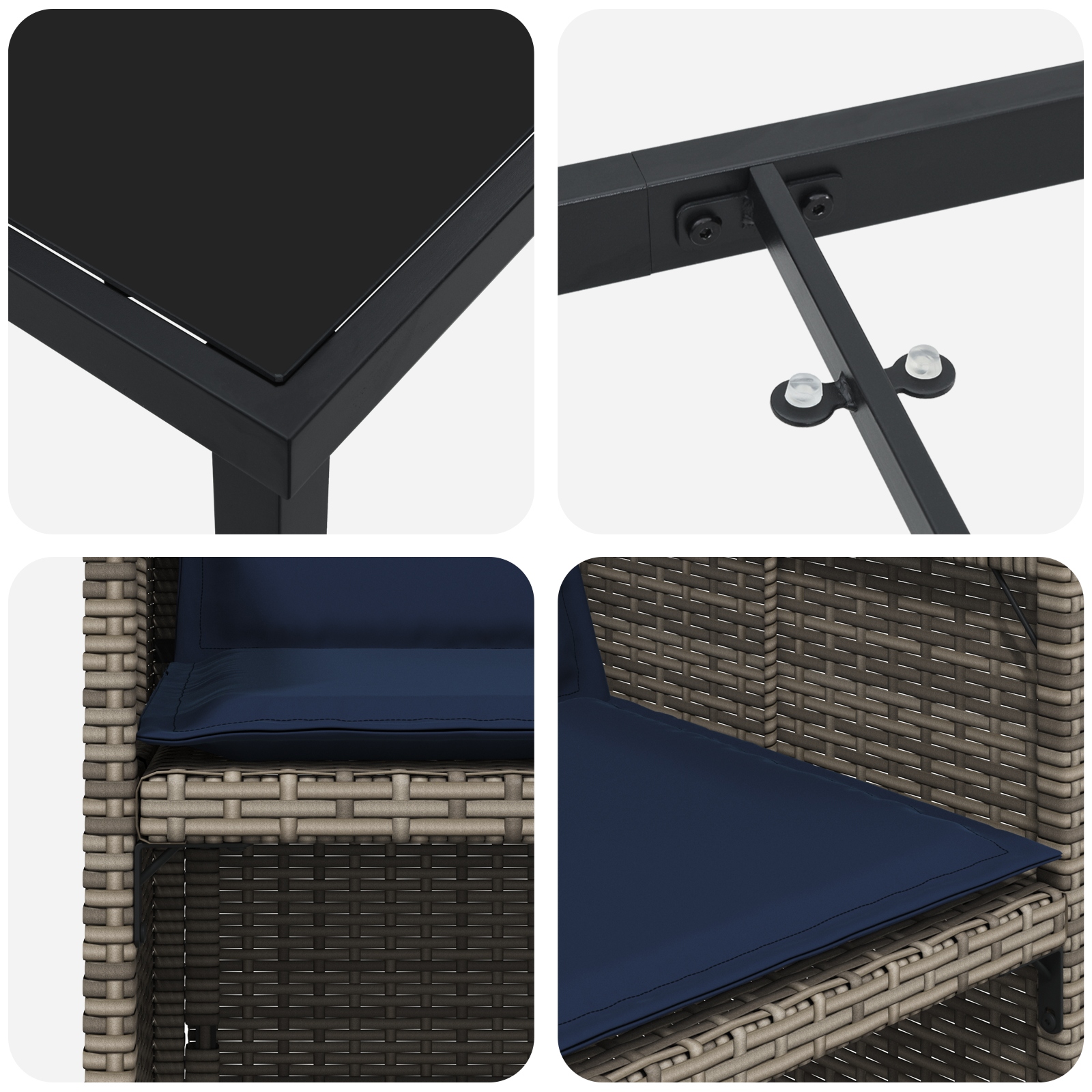 - Componente Incluse: Vei avea scaune împletite cu spătar din poliratan și perne de exterior comode cu închideri tip clapetă pentru ușurință. Blatul din sticlă securizată se așează ideal pe cadru, oferind o suprafață netedă și elegantă. De asemenea, piciorușele din oțel vopsit sunt frumos concepute pentru stabilitate și rezistență.