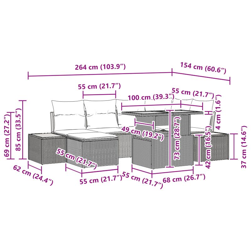 Acest set de dining pentru grădină din poliratan modern transformă spațiile exterioare în locuri luxoase de relaxare. Liniile sale clare și designul contemporan îi permit să se integreze perfect în orice terasă sau grădină, invitându-te să găzduiești întâlniri sau să te bucuri de momente de liniște în aer liber. Creat pentru cei care apreciază atât stilul, cât și practicitatea, acest set oferă un aspect sofisticat cu apariția sa lucioasă și ornamentația minimă, în timp ce oferă confort și funcționalitate utilizatorilor.