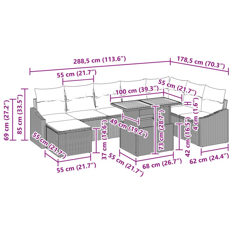 - Componente Incluse: Acest set de grădină cuprinde 2 canapele cu brațe cu depozitare, 1 loc de colț cu depozitare, 4 scaune centrale cu depozitare, 1 taburet cu depozitare și o masă de grădină. Fiecare componentă oferă multiple funcții, asigurând că există întotdeauna spațiu și confort pentru fiecare membru al familiei tale și oaspeții. Șezuturile sunt dotate cu perne umplute cu spumă pentru un confort suplimentar.