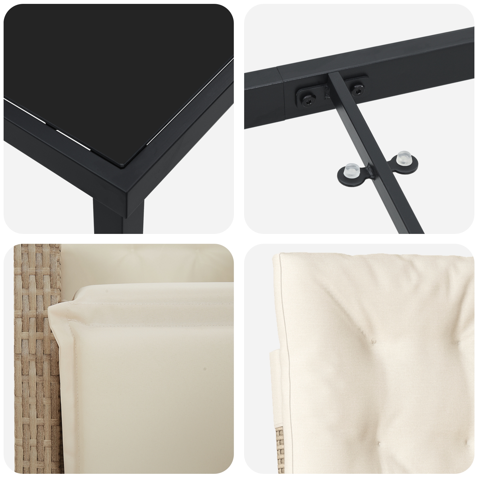 • Materiale de Calitate: Fabricat din poliratan de top, care e rezistent și chiar suportă vremea, acest set e ideal pentru exterior. Suprafețele din sticlă dau un vibe elegant și se curăță ușor.