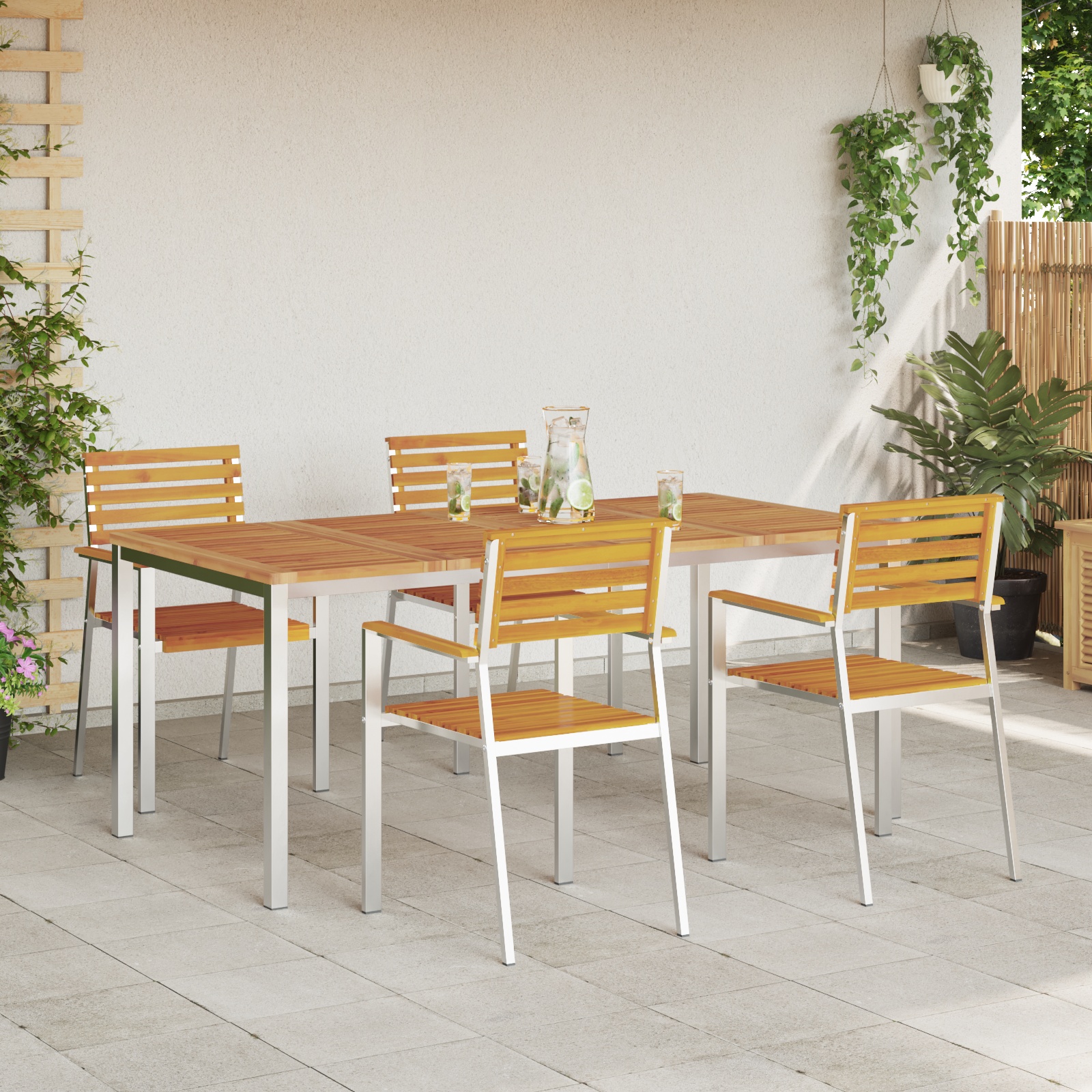 • Cadru fix cu șipci – Setul ăsta vine cu un cadru fix cu șipci, perfect pentru exterior. Permite circulația aerului și se usucă repede, iar șipcile sunt rezistente la uzură.