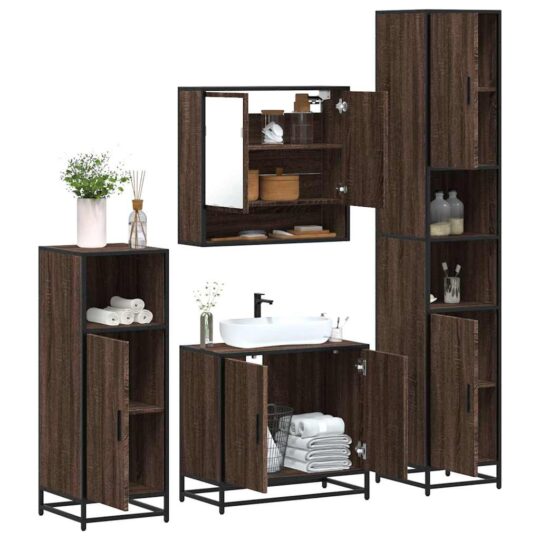 Set de mobilier de baie din 4 piese din lemn de stejar maro