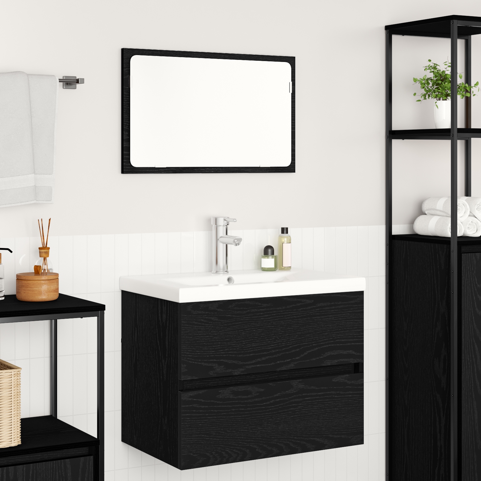 Setul ăsta trendy de mobilier pentru baie îmbină un design elegant cu o funcționalitate super smart, făcându-l o alegere excelentă pentru casele moderne. Cu liniile sale curate și fără prea multe detalii, aduce un plus oricărei băi, fiind foarte util cu montarea pe perete. E gândit să folosești la maximum fiecare colțișor, perfect pentru oricine vrea să aibă o experiență plăcută în baie, fie că ești singur sau cu familia. E făcut din lemn prelucrat și metal, combinând stilul cu utilitatea zilnică, oferindu-ți un aspect fain și confort.