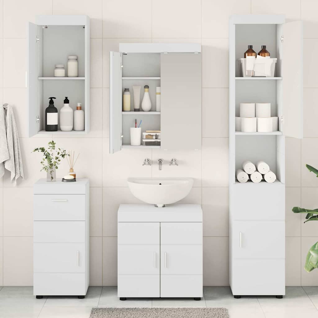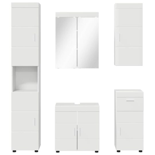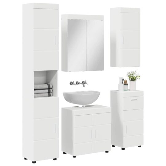 Setul ăsta modern de dulapuri pentru baie aduce un look elegant și simplu. E gândit foarte bine atât pentru a fi util, cât și pentru a arăta bine. Fabricat din lemn prelucrat, oferă o soluție de stocare stabilă și durabilă, perfectă pentru diferite tipuri de băi. Are destul spațiu pentru toate esențialele, iar textura netedă și finisajul mat adaugă un strop de eleganță. Se integrează superb în orice decor de baie.