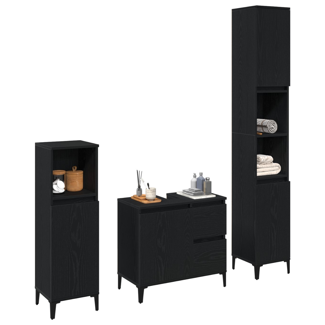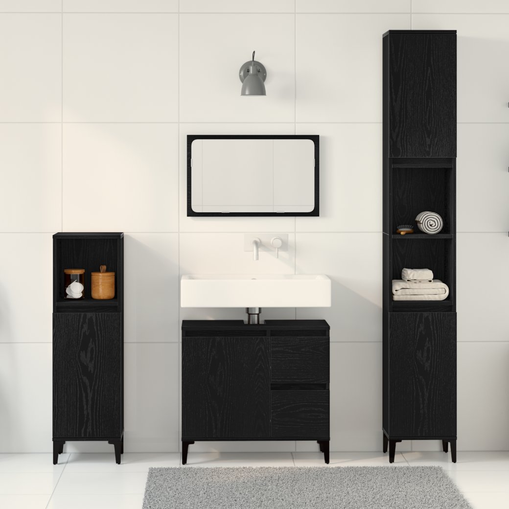 Setul ăsta modern pentru baie e o modalitate super faină de a-ți organiza lucrurile. Cu un stil minimalist și elegant, arată grozav cu orice decor contemporan. Are un mix plăcut de sertare și rafturi, așa că ai mult spațiu să ții baia ordonată și neatinsă. Partea asta din lemn prelucrat îl face și super durabil, fără să piardă din stil.
