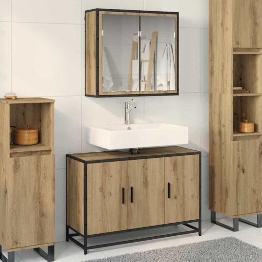 • Depozitare Versatilă: Dulapul pentru chiuvetă are compartimente suficiente pentru a-ți organiza obiectele personale, produsele de baie și prosoapele. Cu uși încastrate și mâneri tip bară din metal, setul e creat să maximizeze spațiul și să țină dezordinea departe.