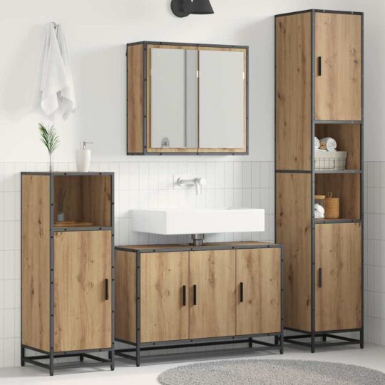 • materiale de calitate: Setul ăsta de mobilă pentru baie e construit din lemn prelucrat și un cadru metalic solid care promit durabilitate și stabilitate, adică aduce un pic de clasă în decorul băii tale. Lemnul ăsta e ușor de curățat, iar elementele metalice oferă suport serios. Ce combinație faină de stil și rezistență, face din ăsta o alegere de încredere în baia ta modernă.