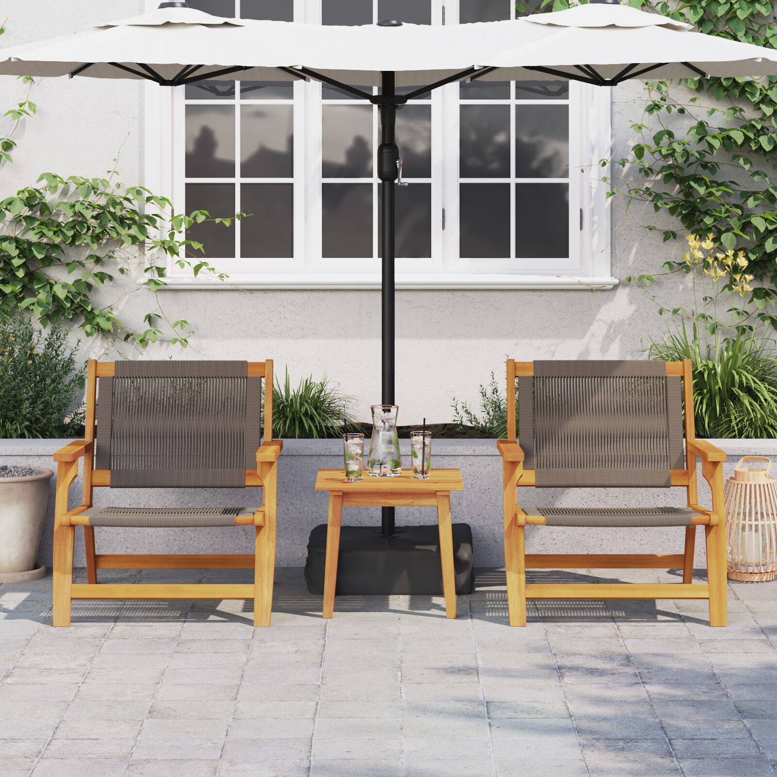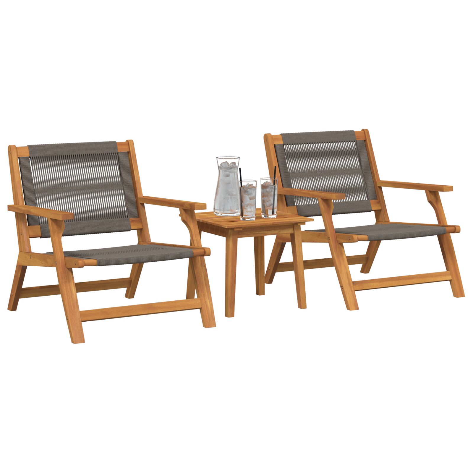- Componente Incluse: Setul complet include cotiere ergonomice și cadre solide din lemn masiv de acacia. Scaunele cu perne din poliratan adaugă confort și rezistență. Totul se îmbină perfect, transformând grădina ta într-un loc primitor unde stilul se întâlnește cu funcționalitatea.